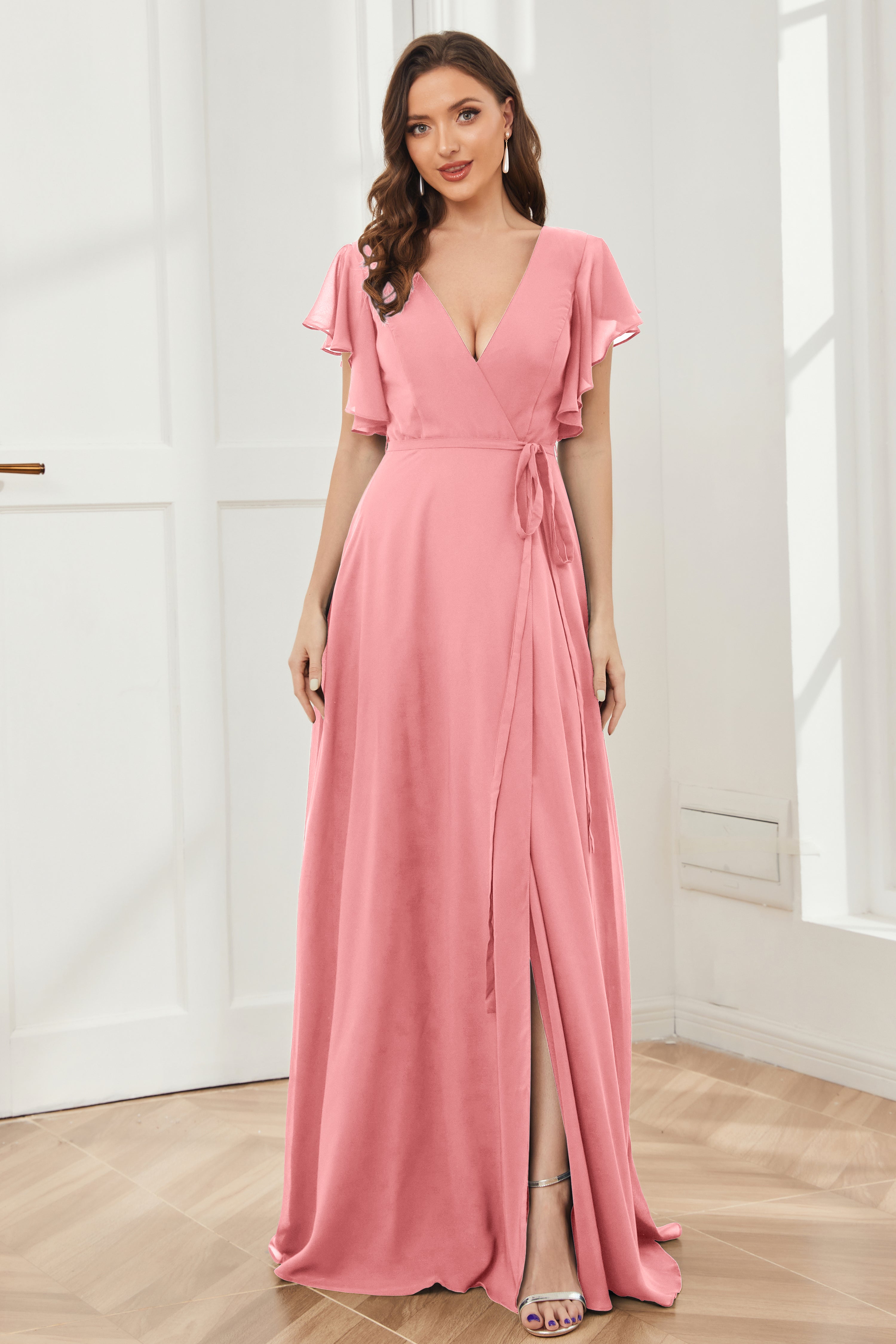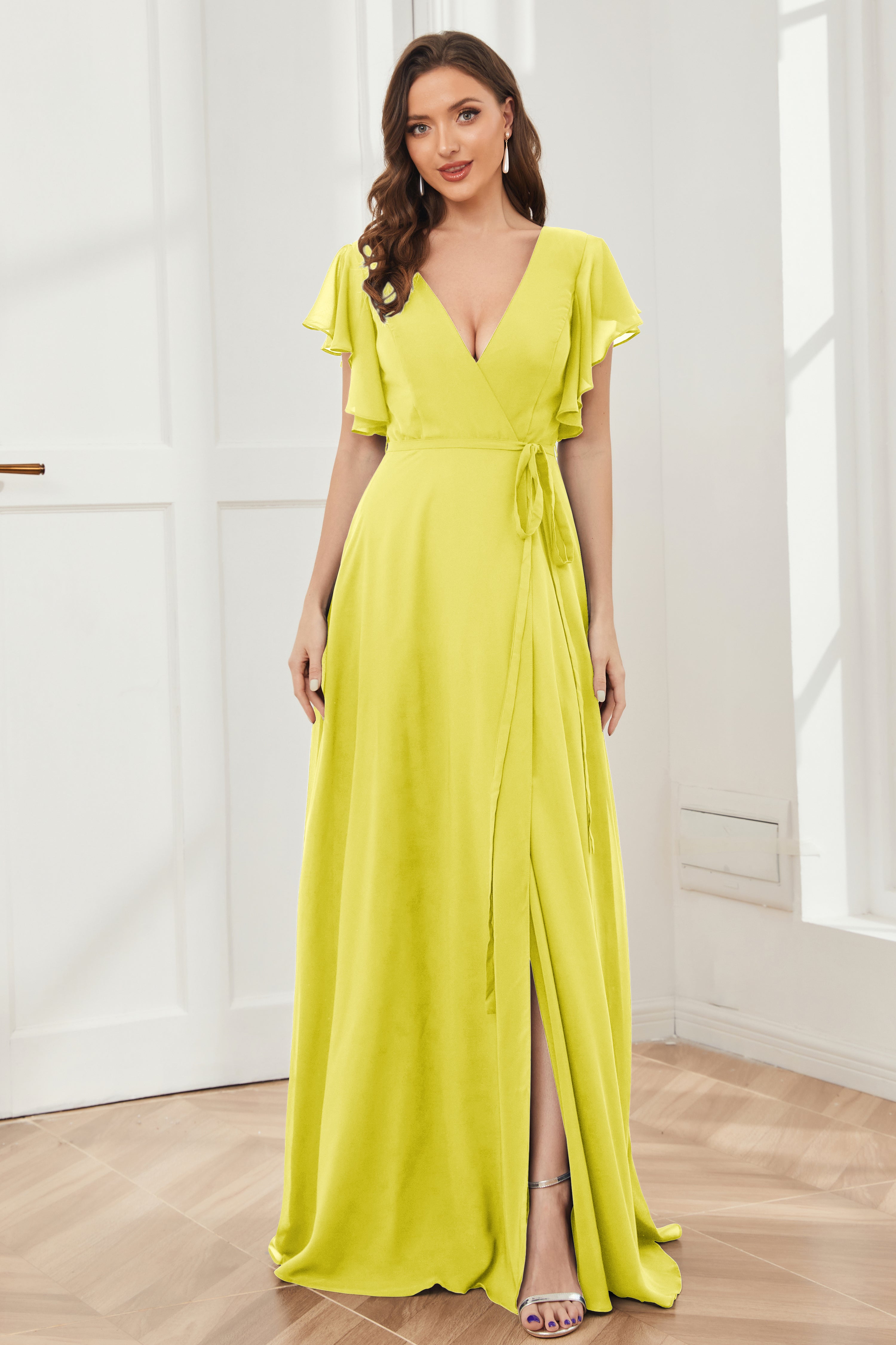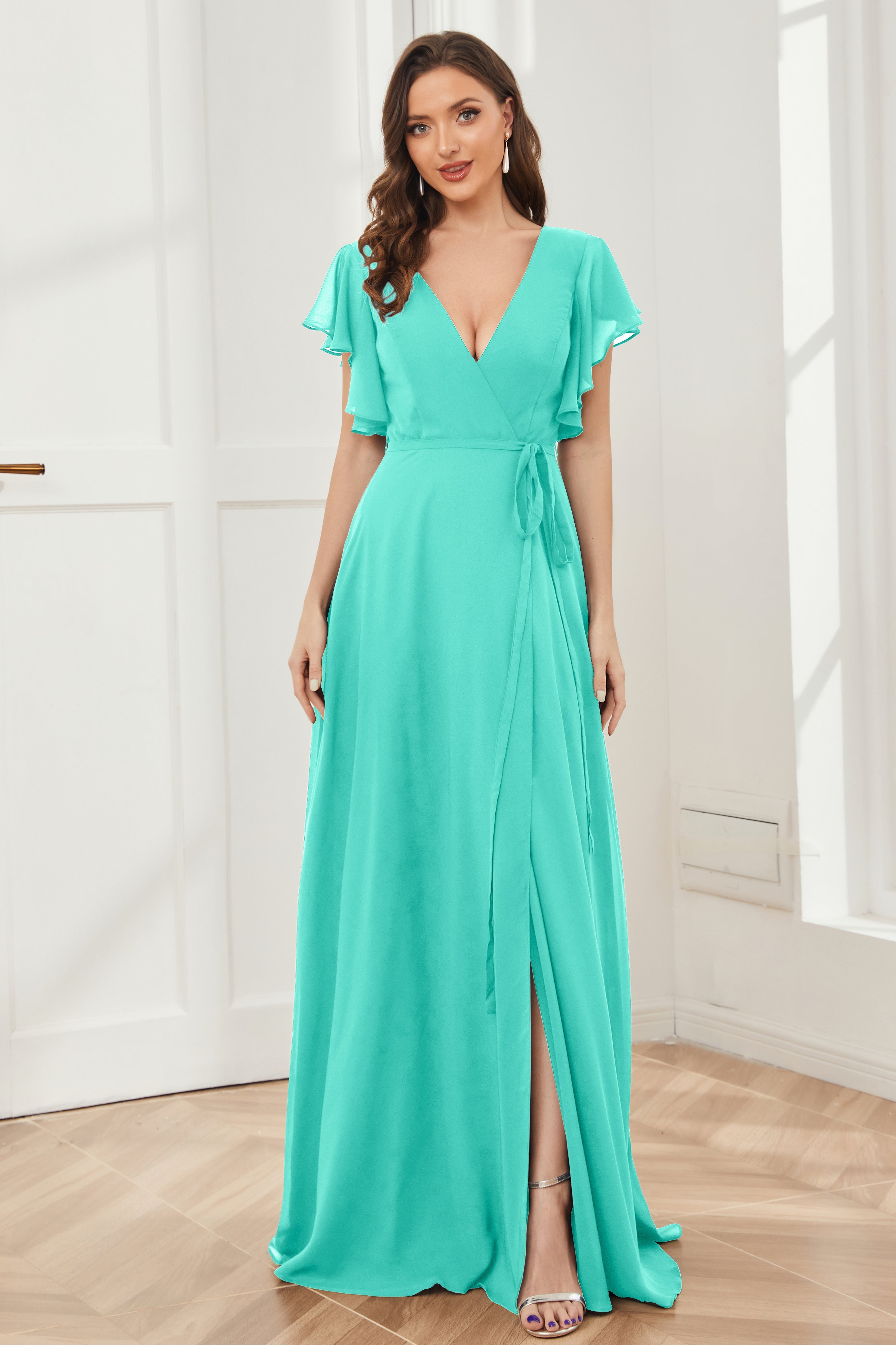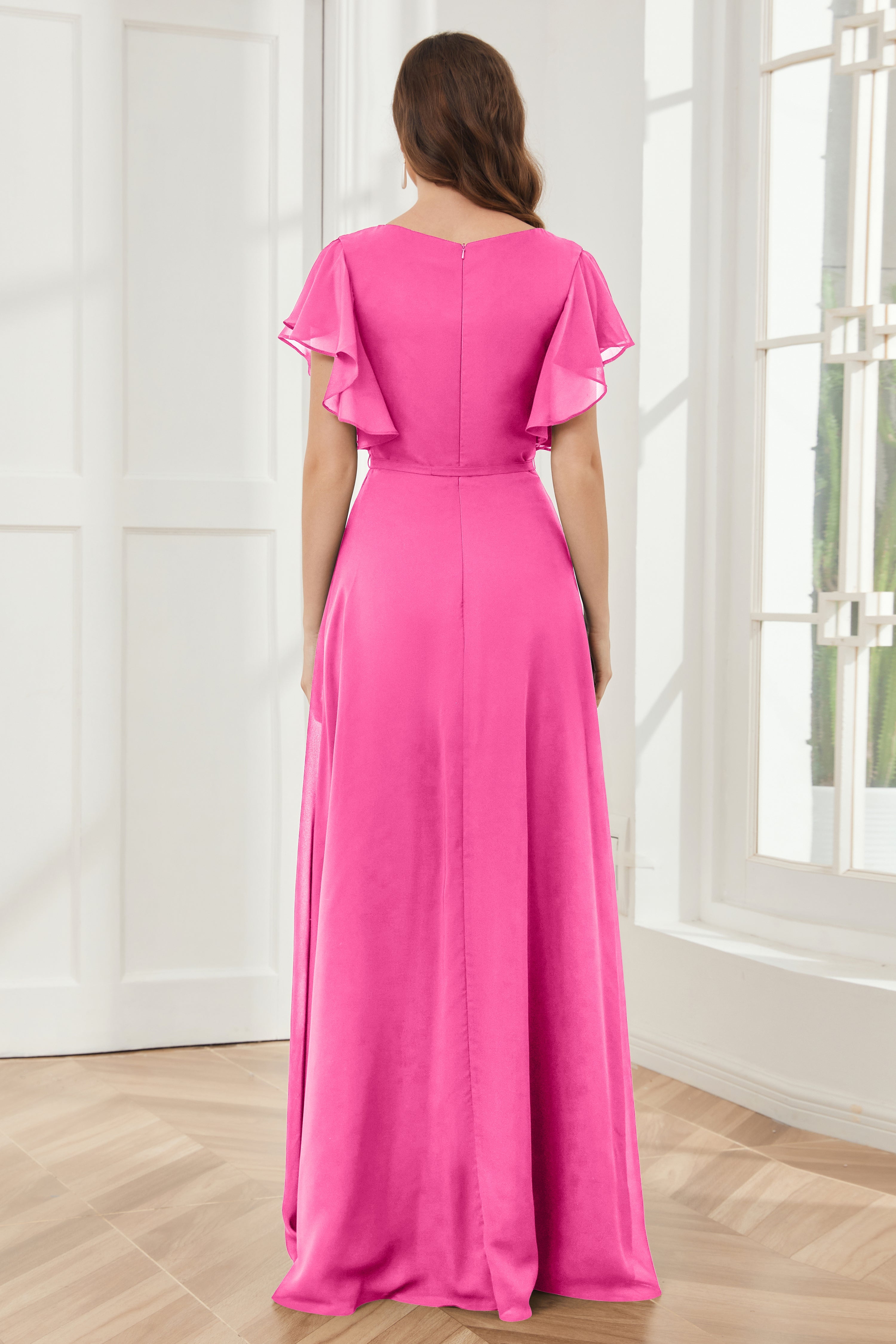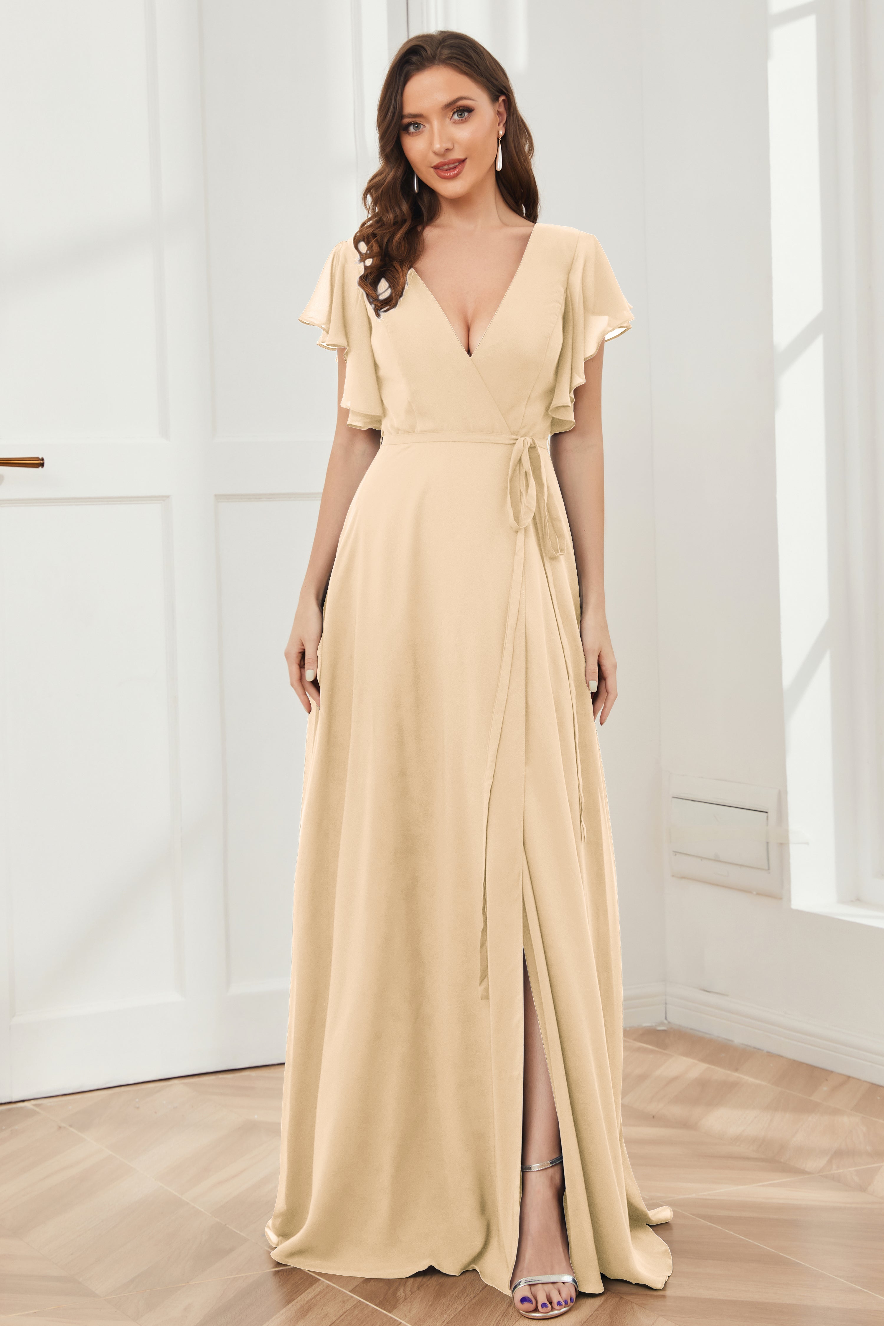 V-neck Ruffles Sleeves Chiffon Bridesmaid Dresses with Slit