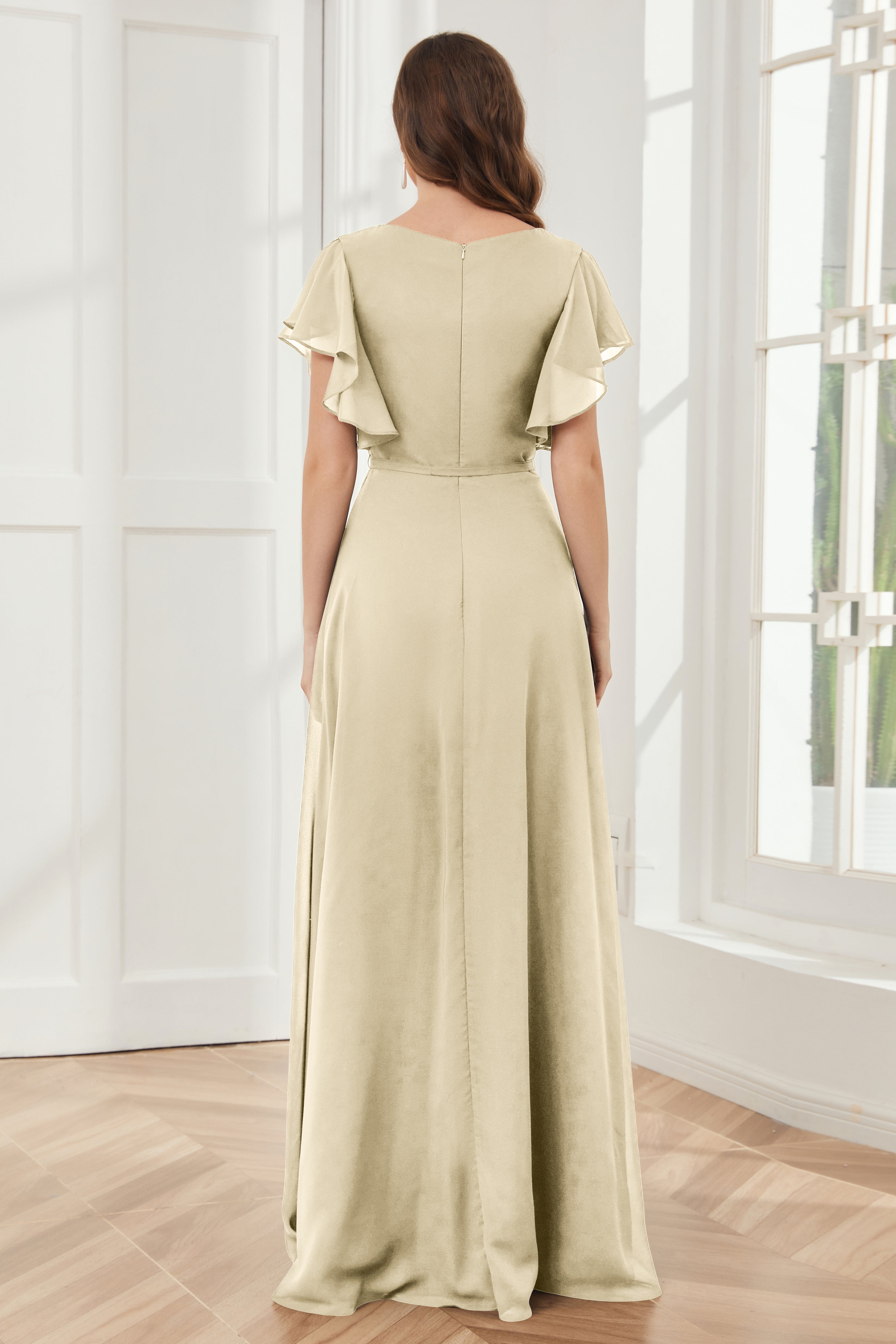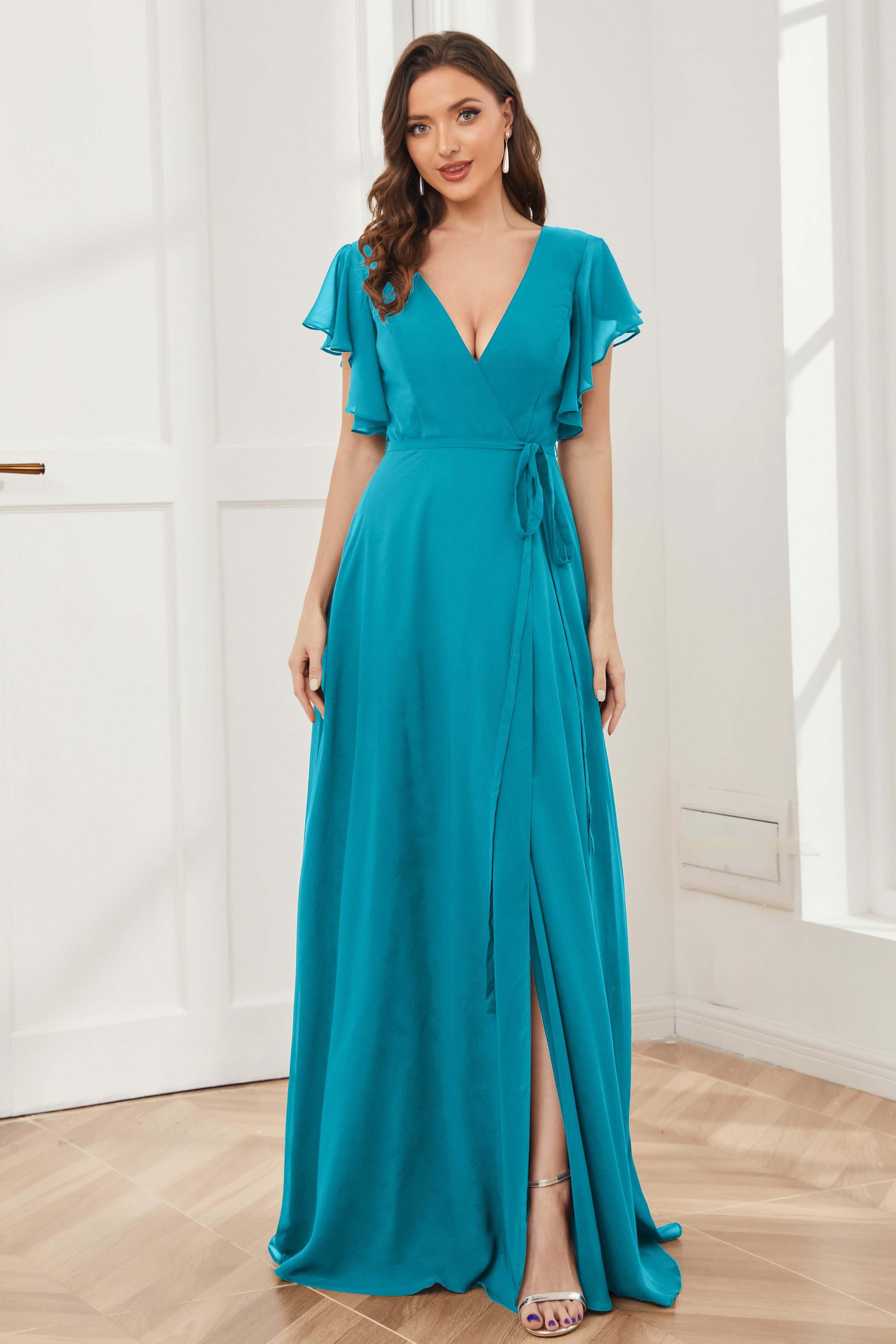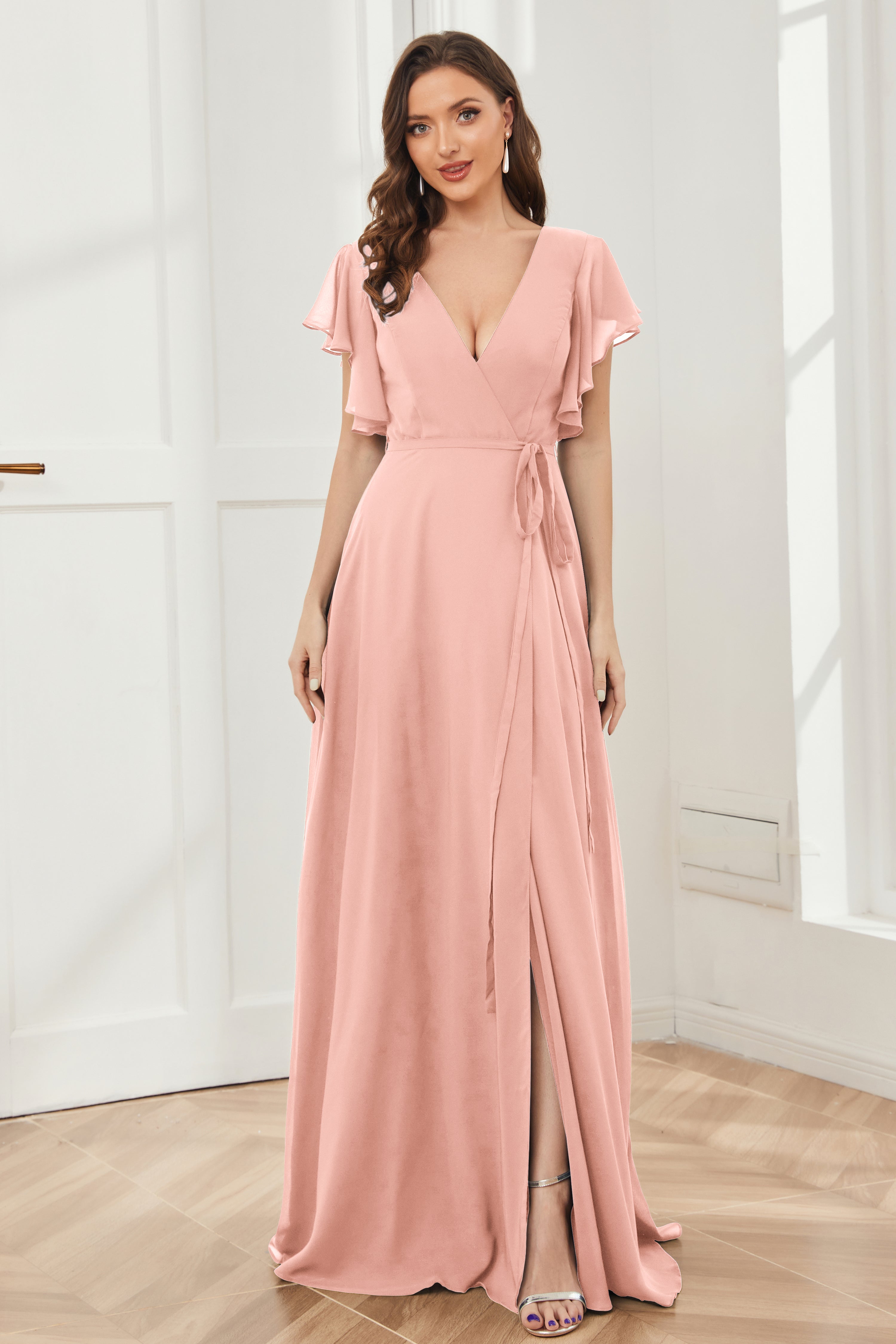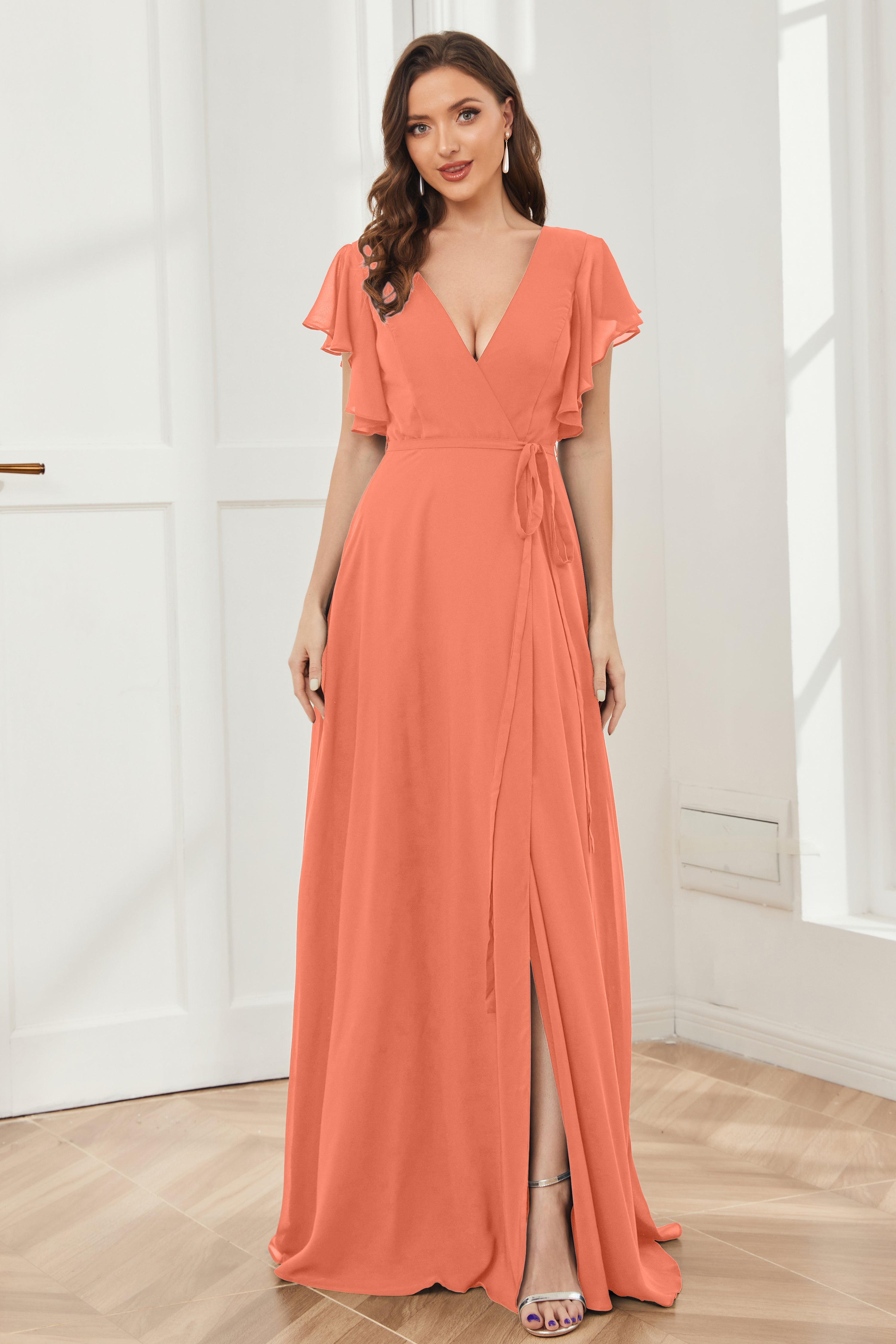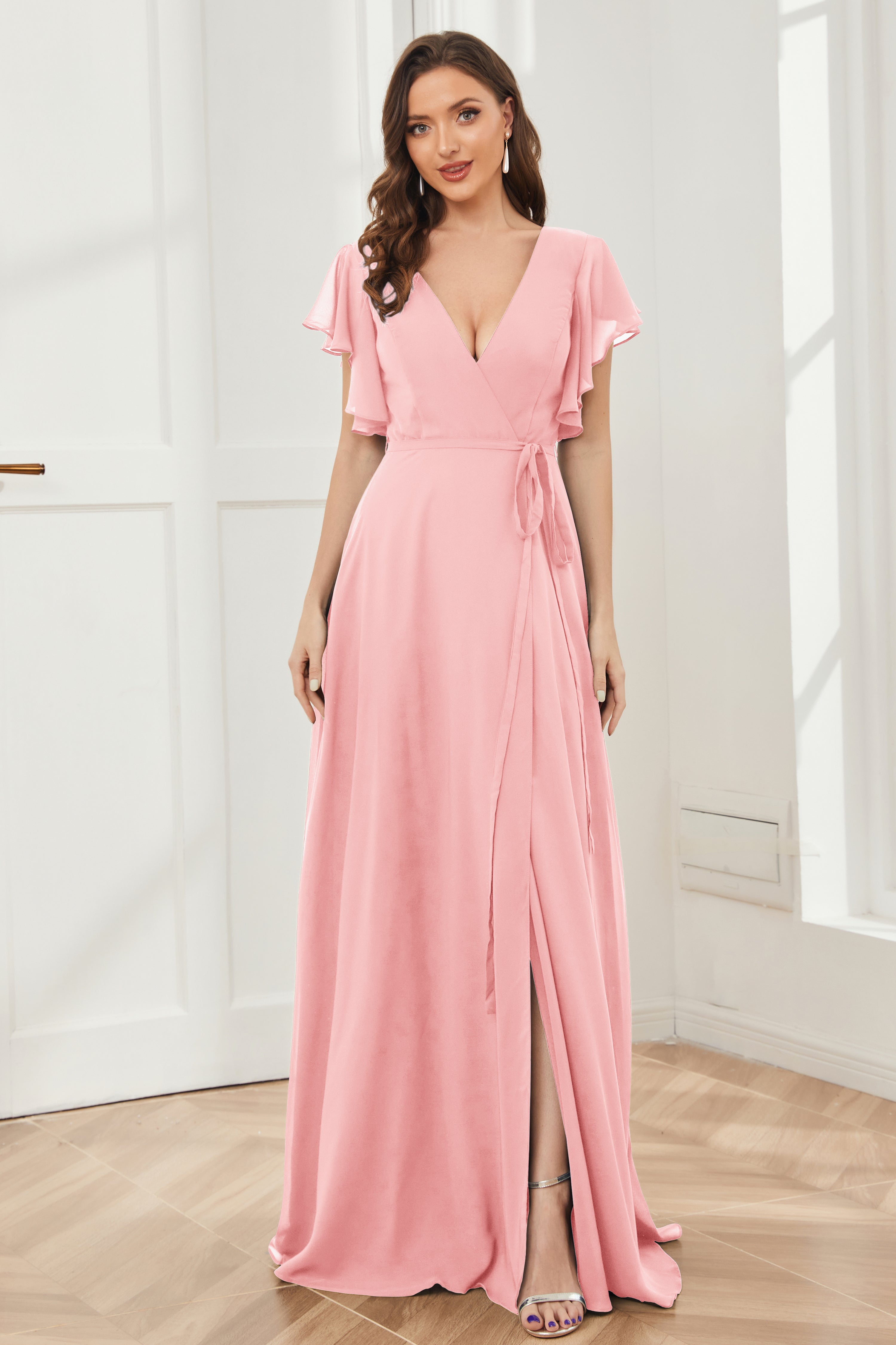 V-neck Ruffles Sleeves Chiffon Bridesmaid Dresses with Slit