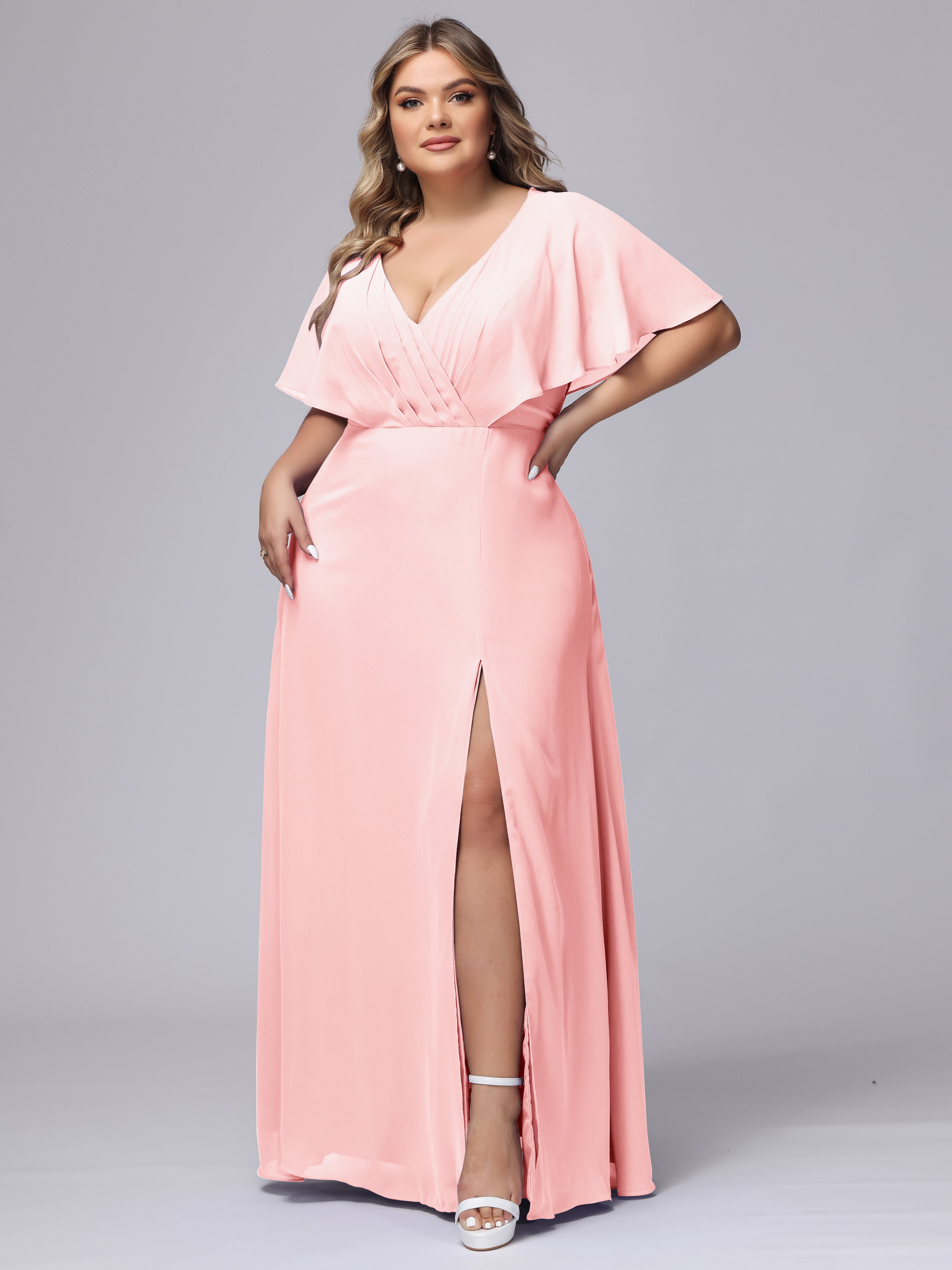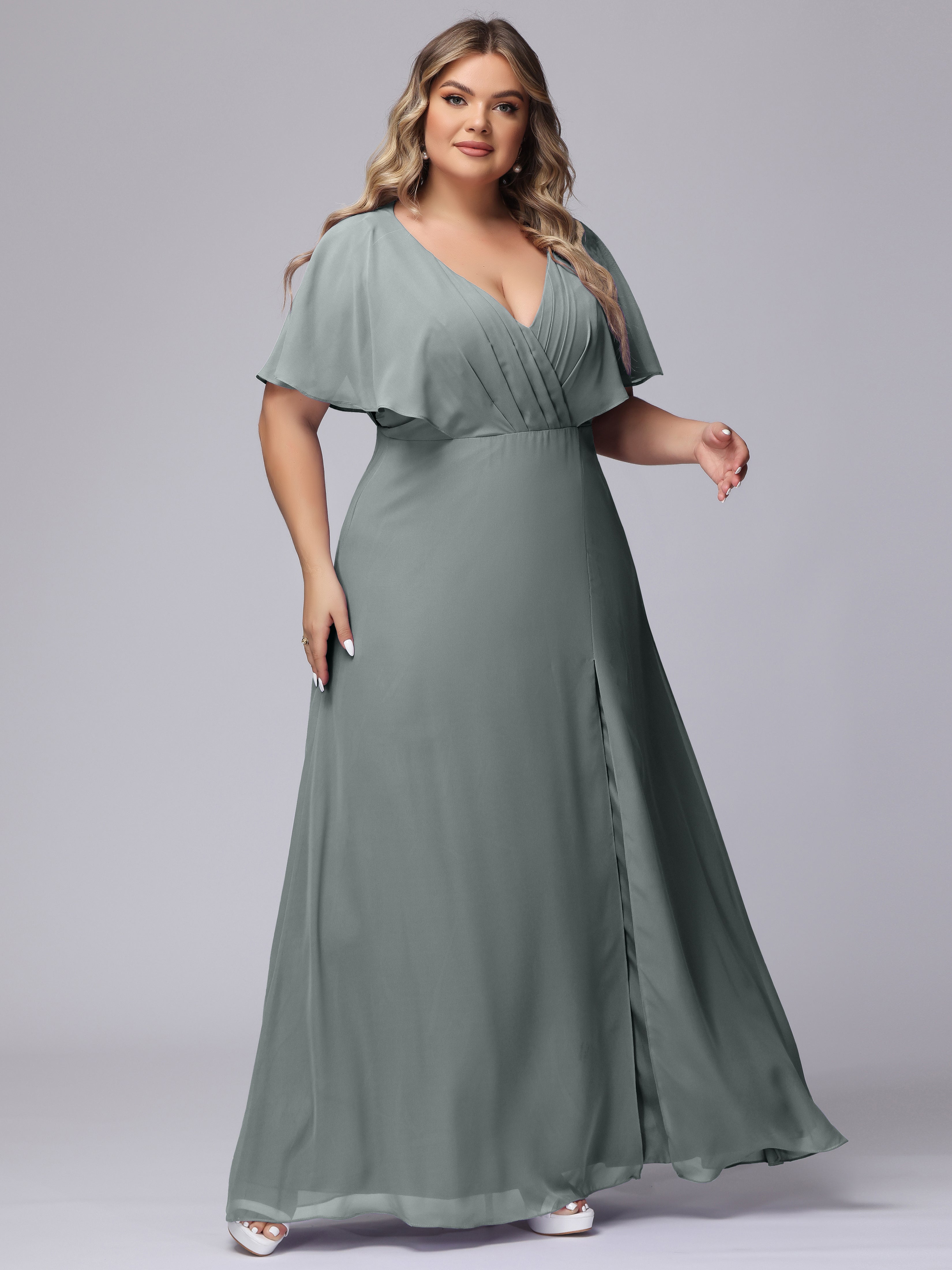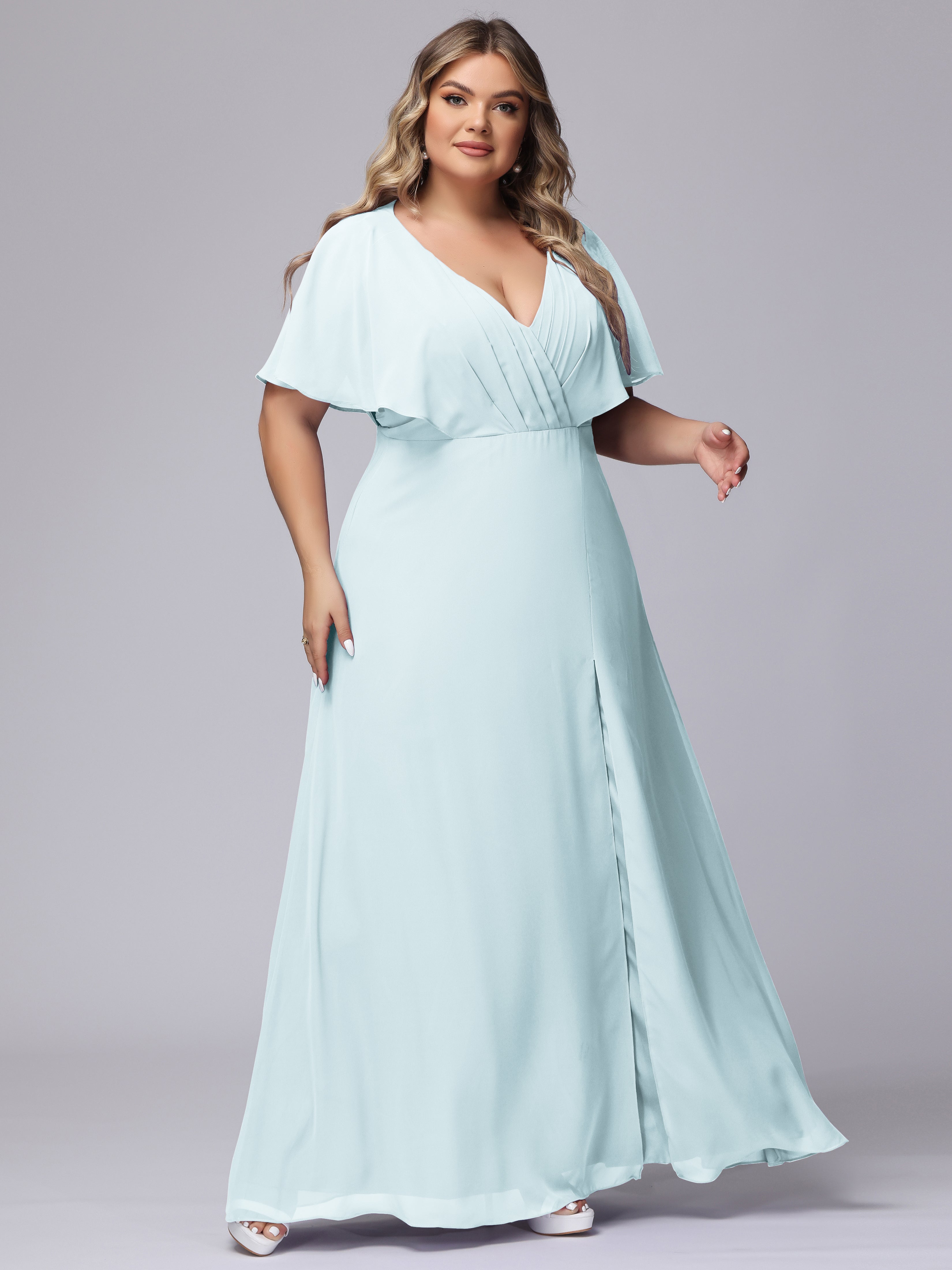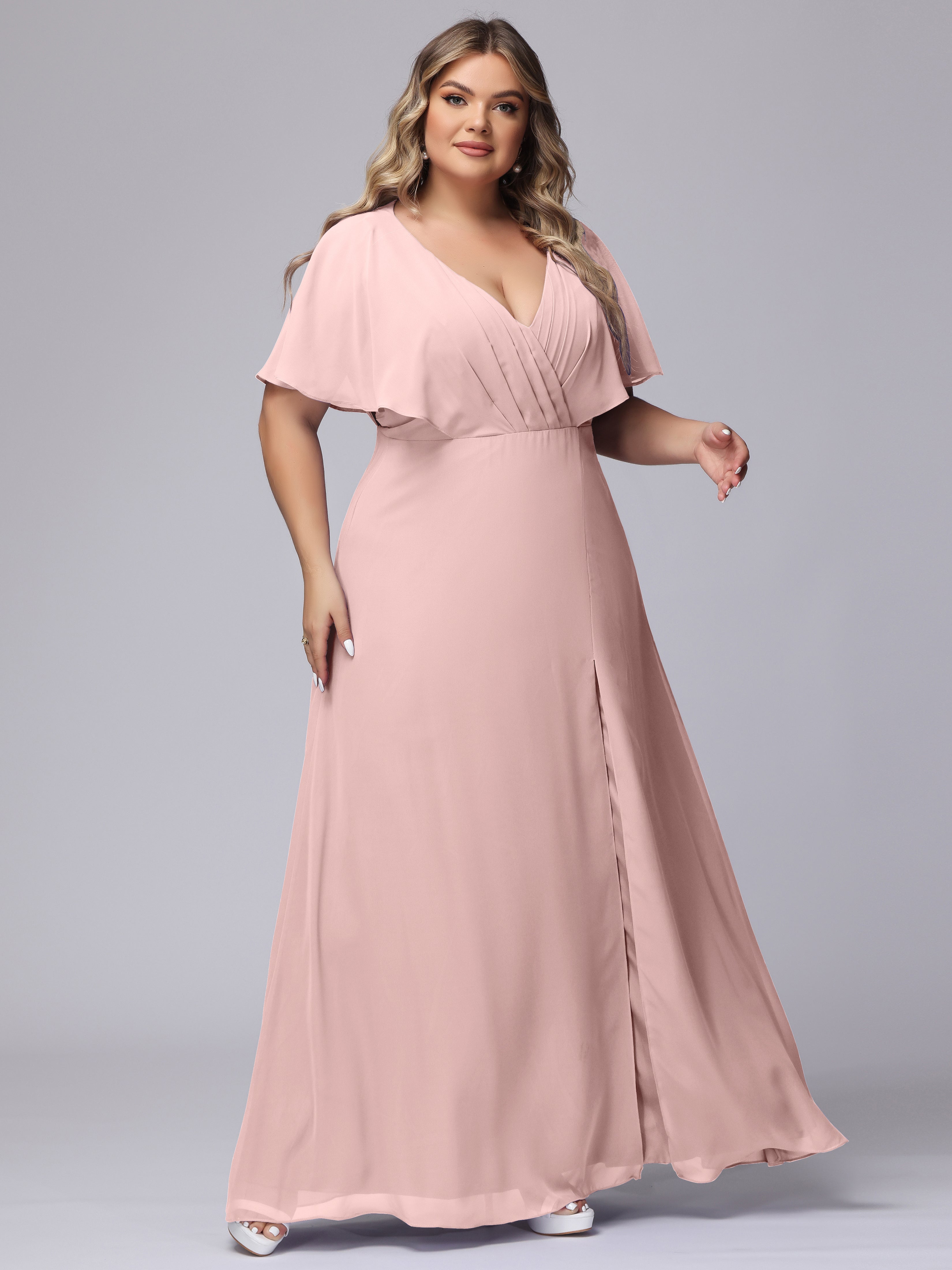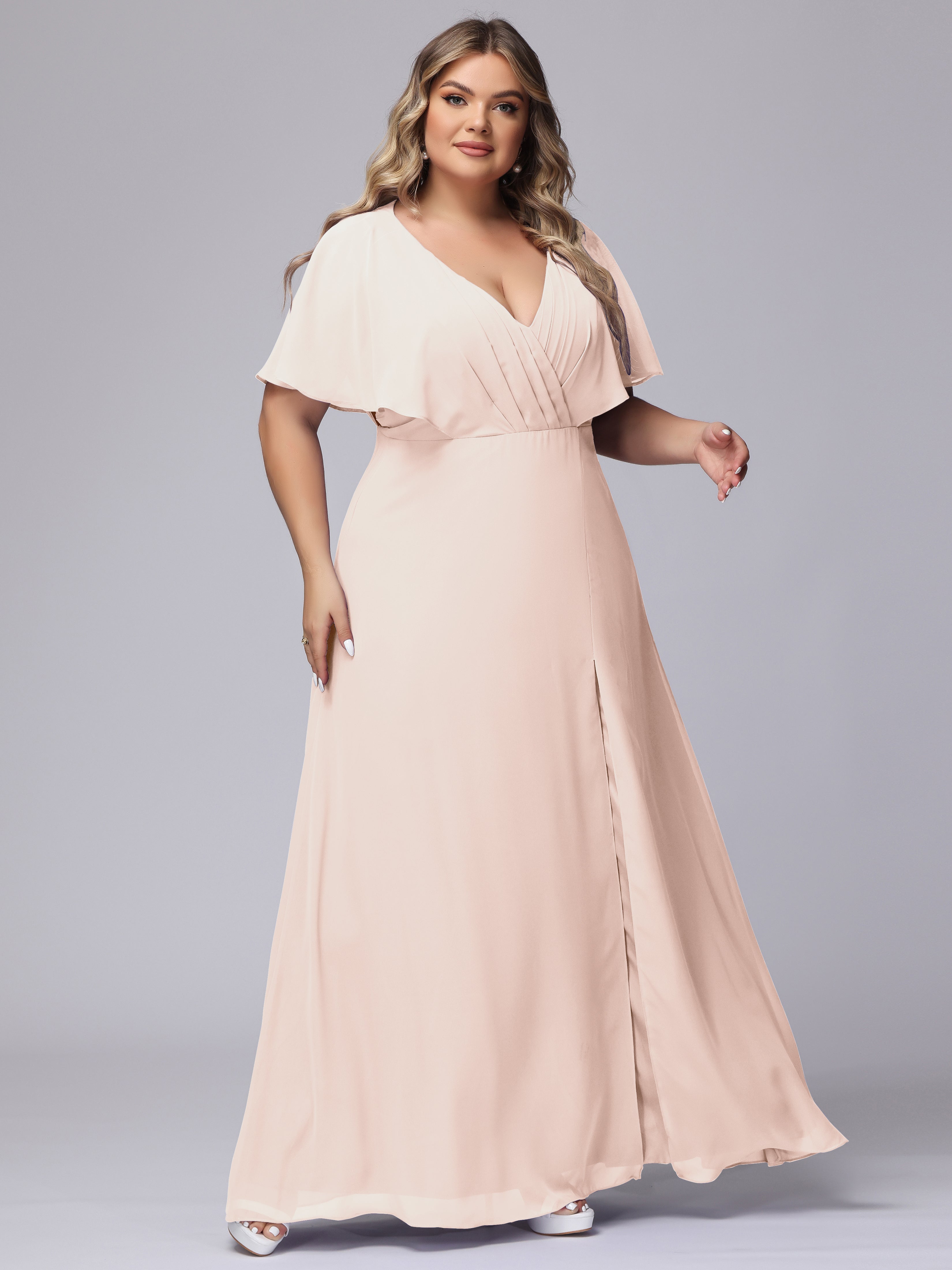 V-Neck Chiffon Short Sleeves Plus Size Bridesmaid Dresses