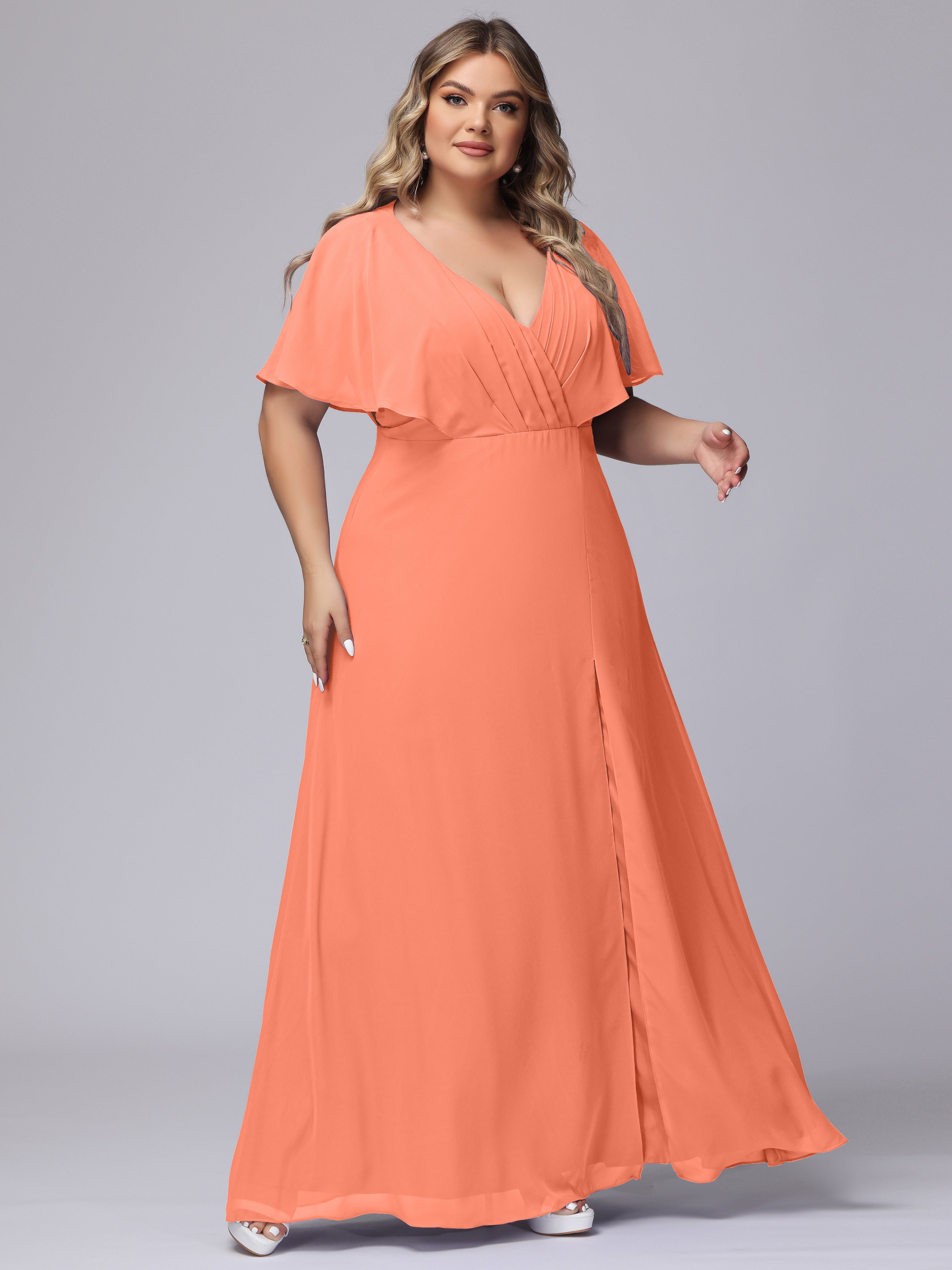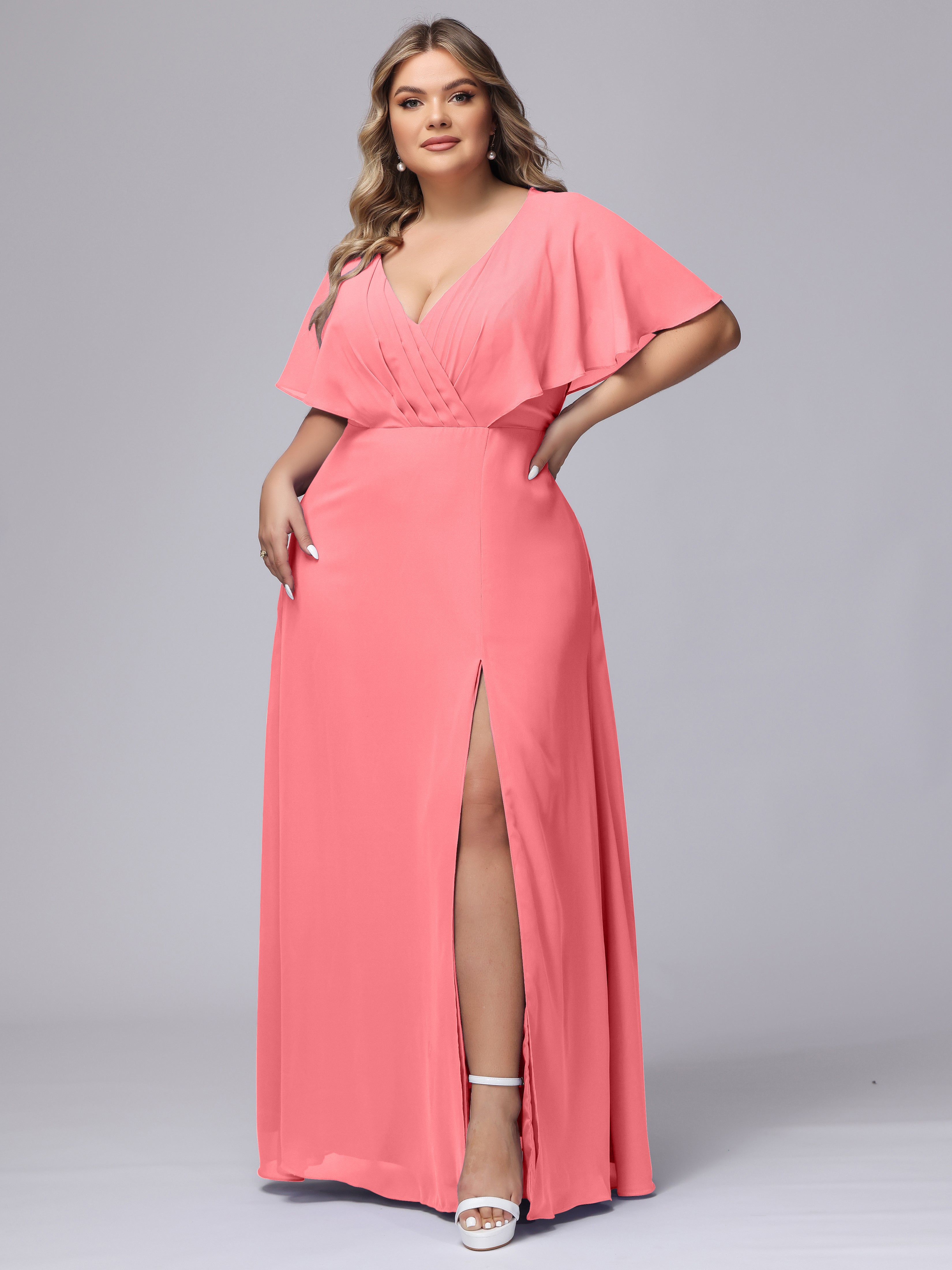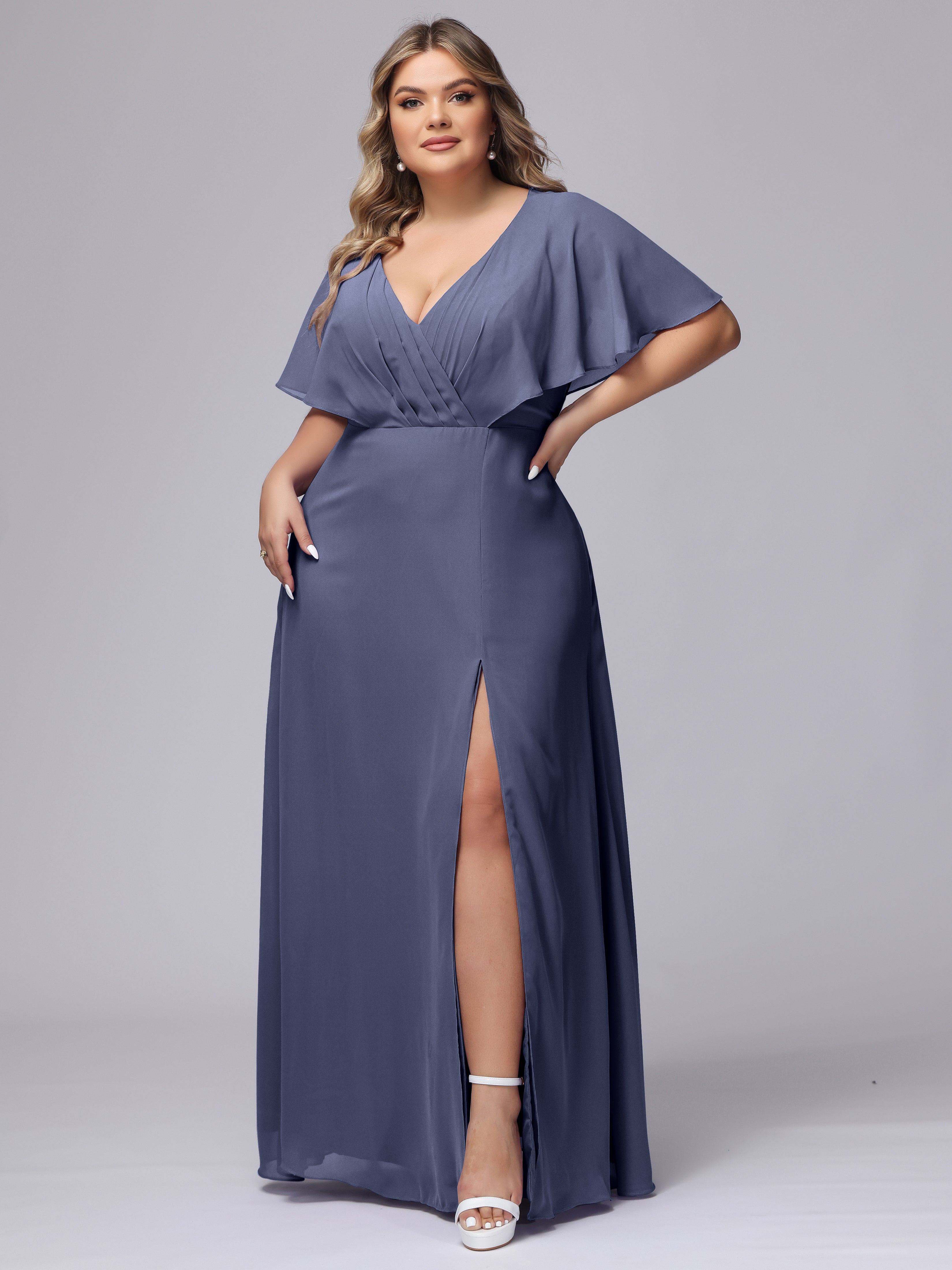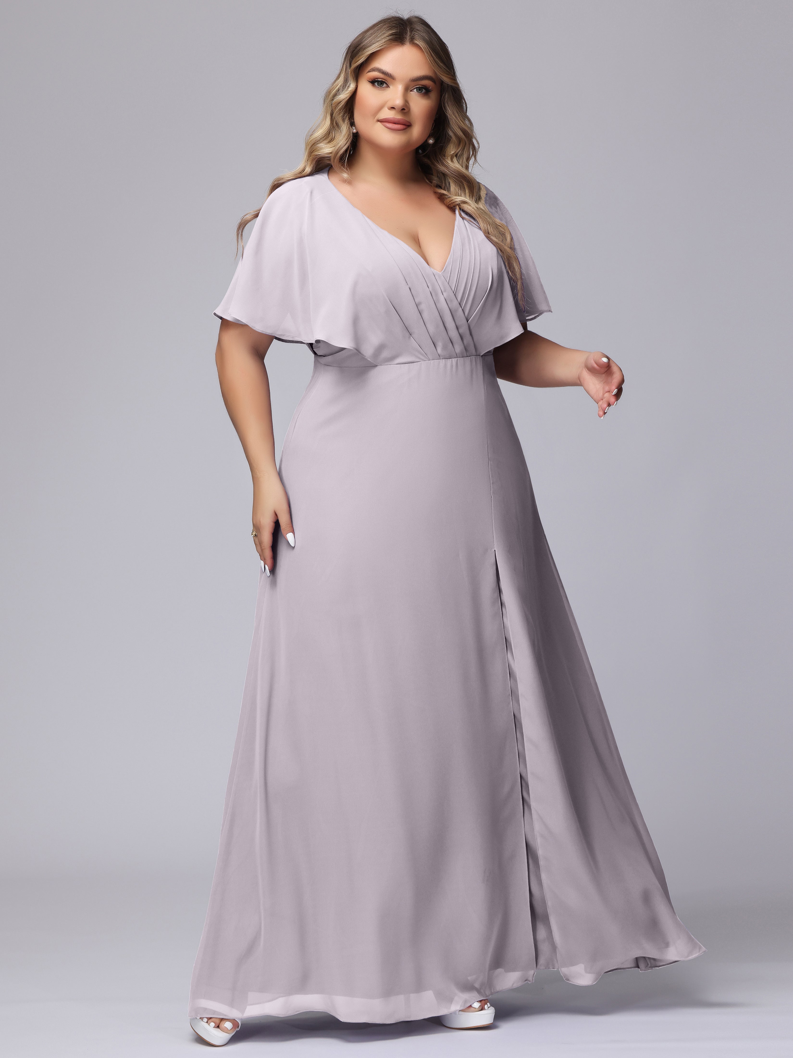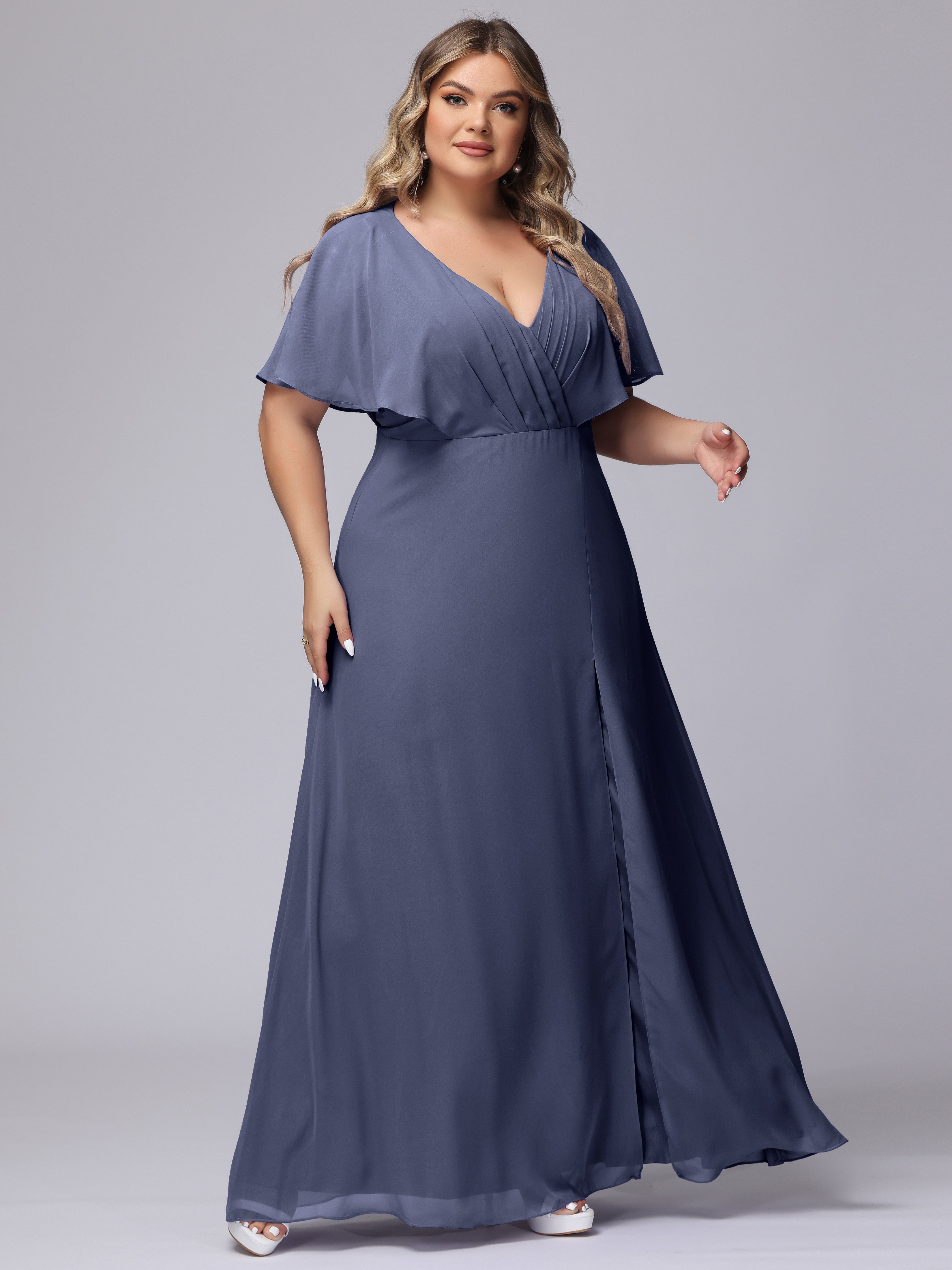 V-Neck Chiffon Short Sleeves Plus Size Bridesmaid Dresses