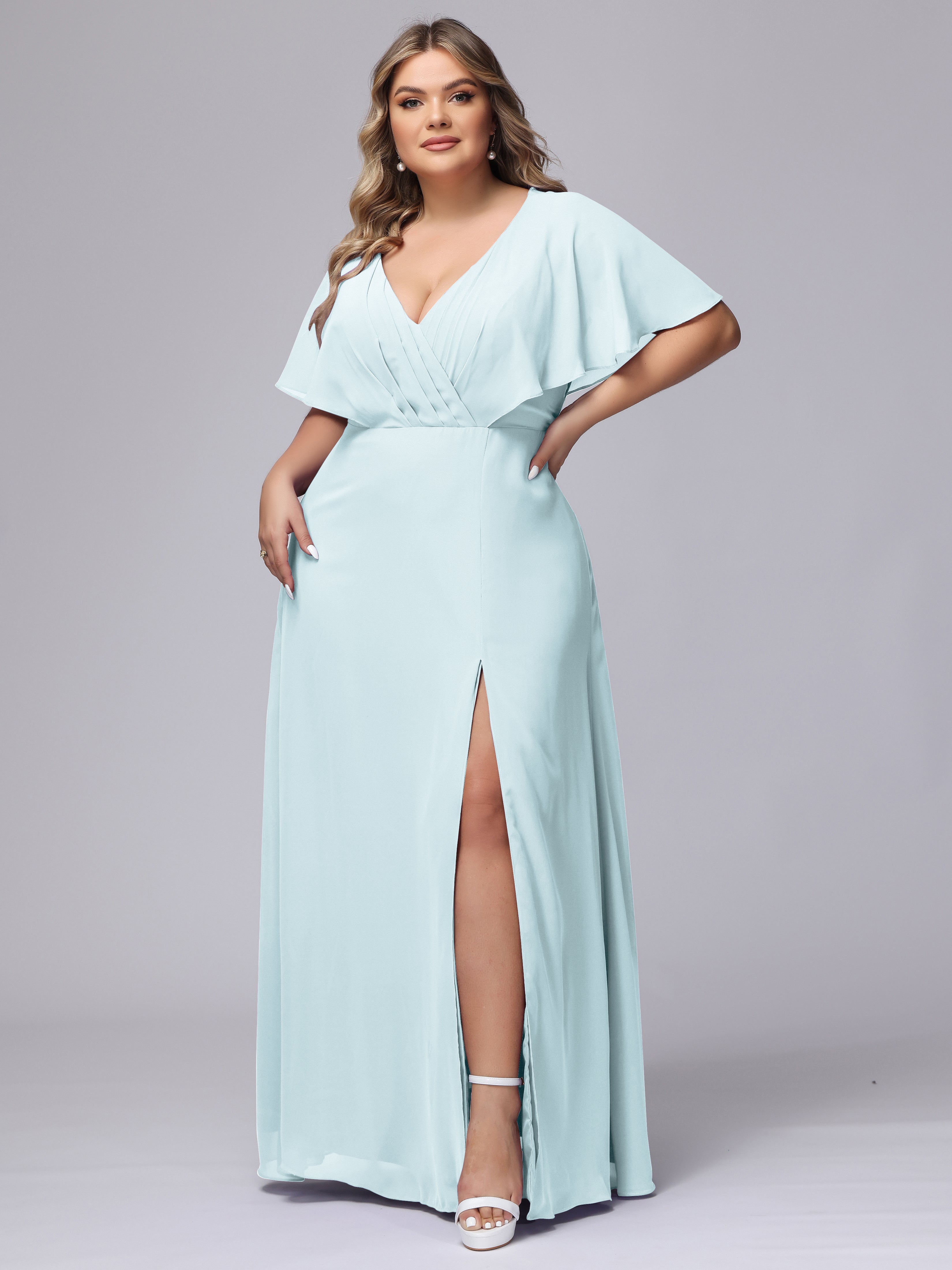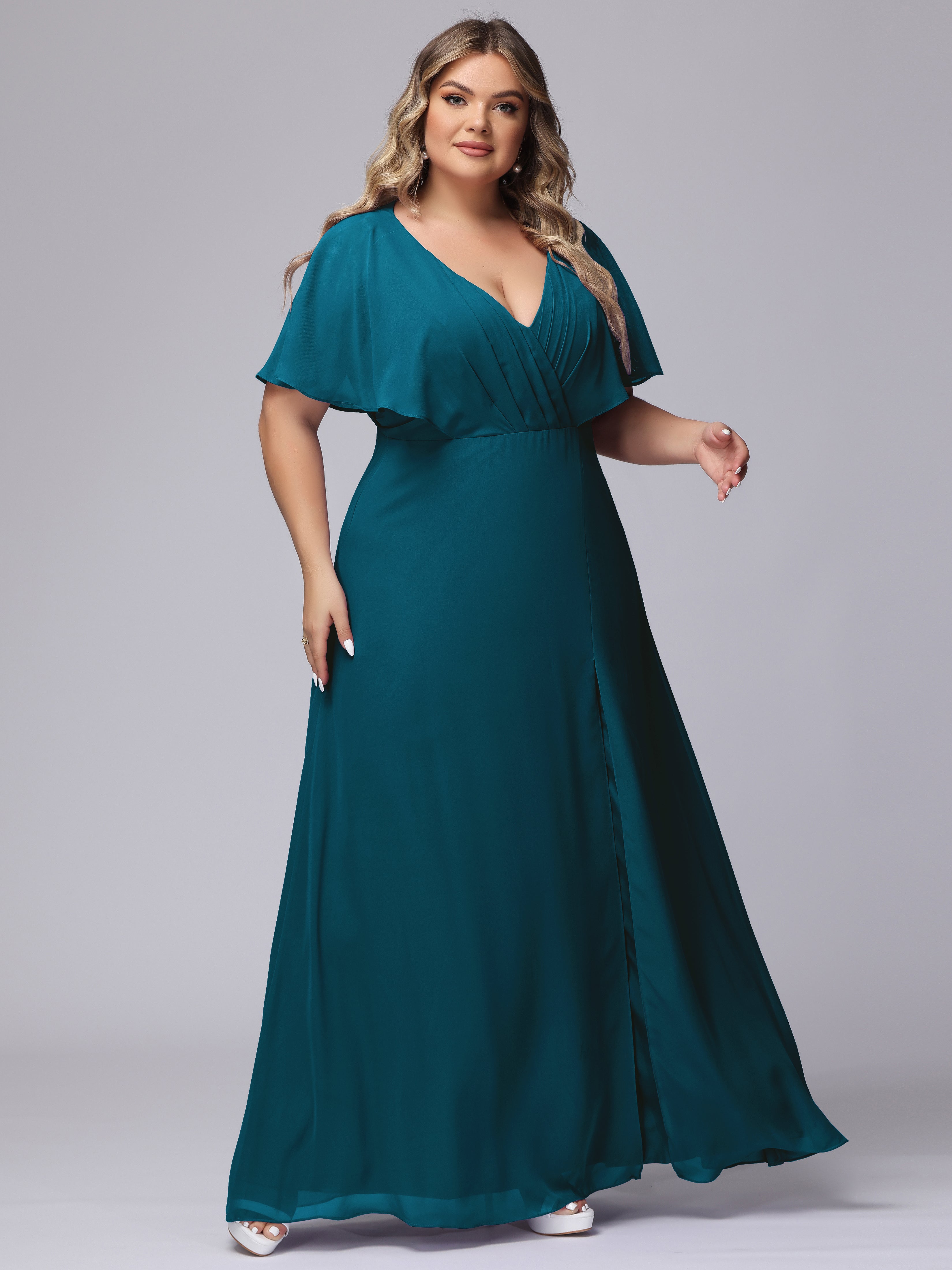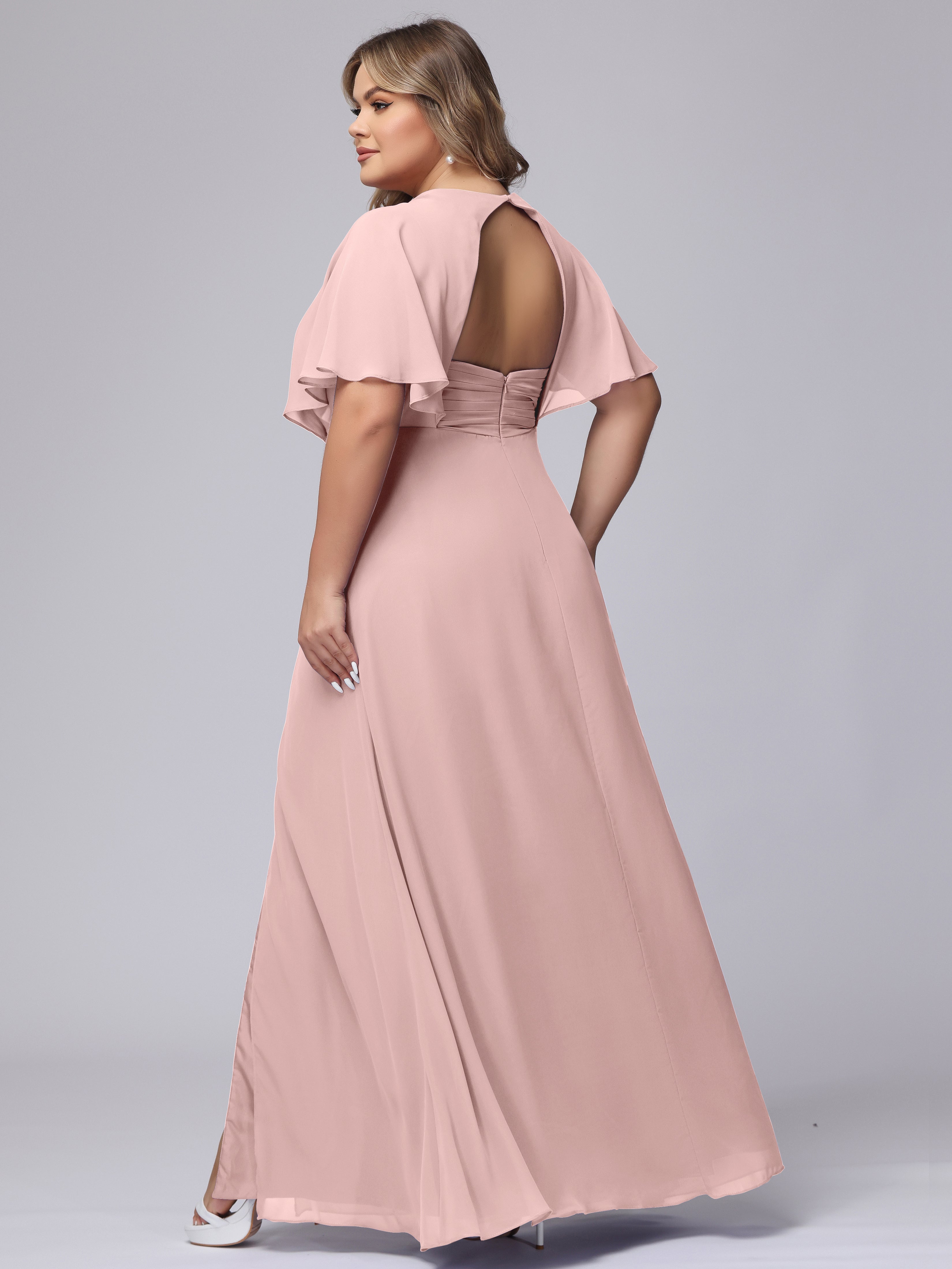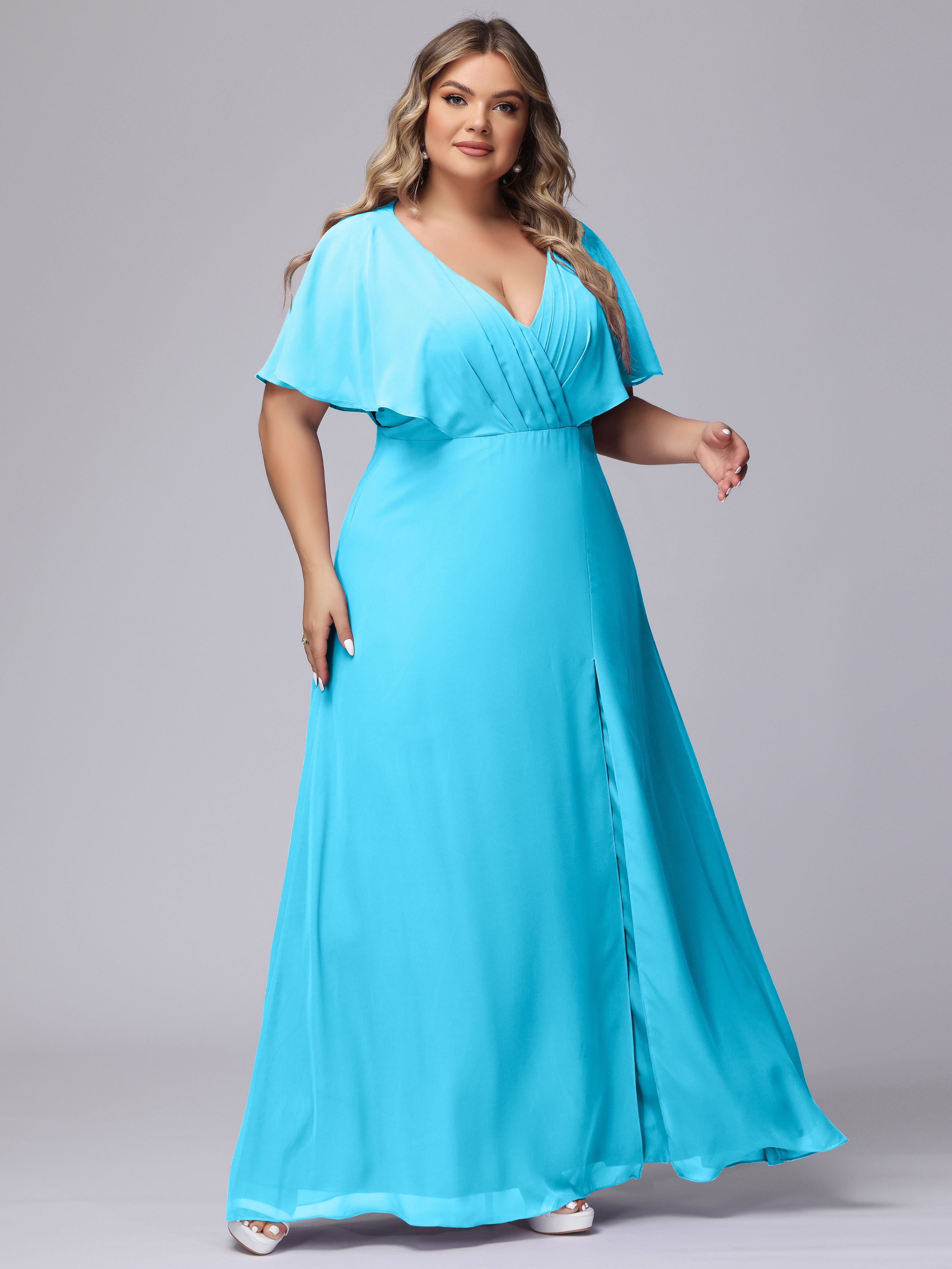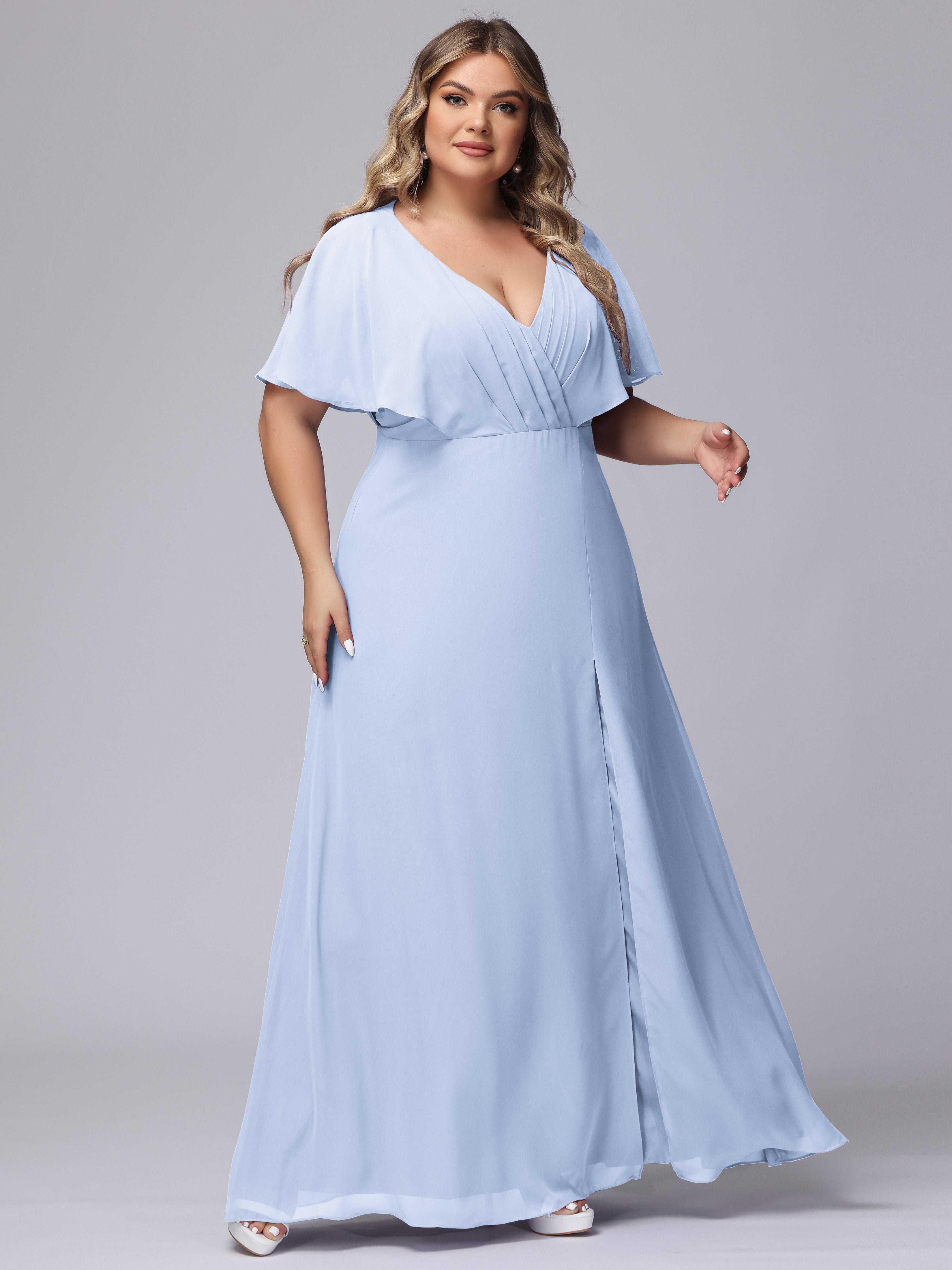 V-Neck Chiffon Short Sleeves Plus Size Bridesmaid Dresses