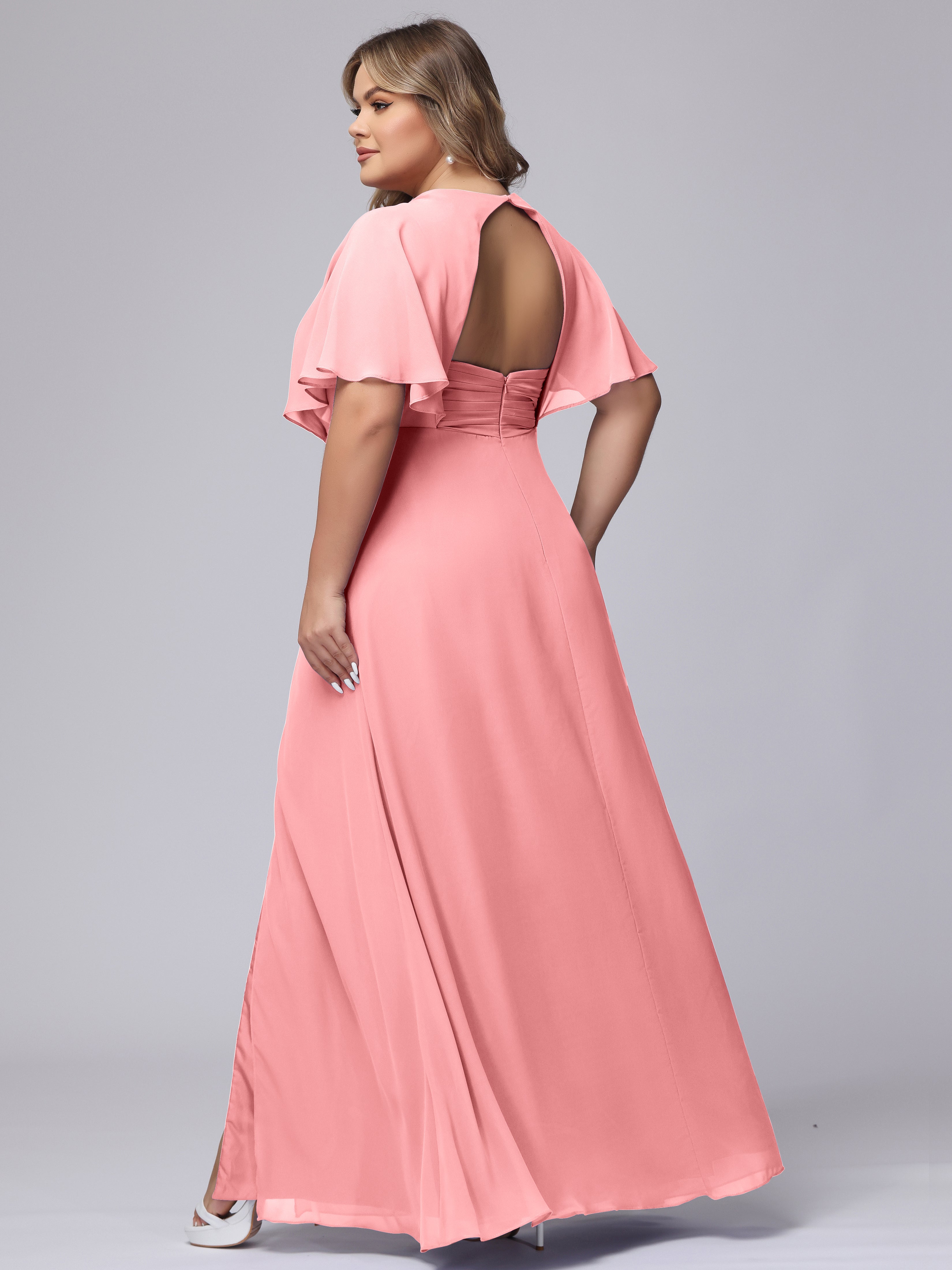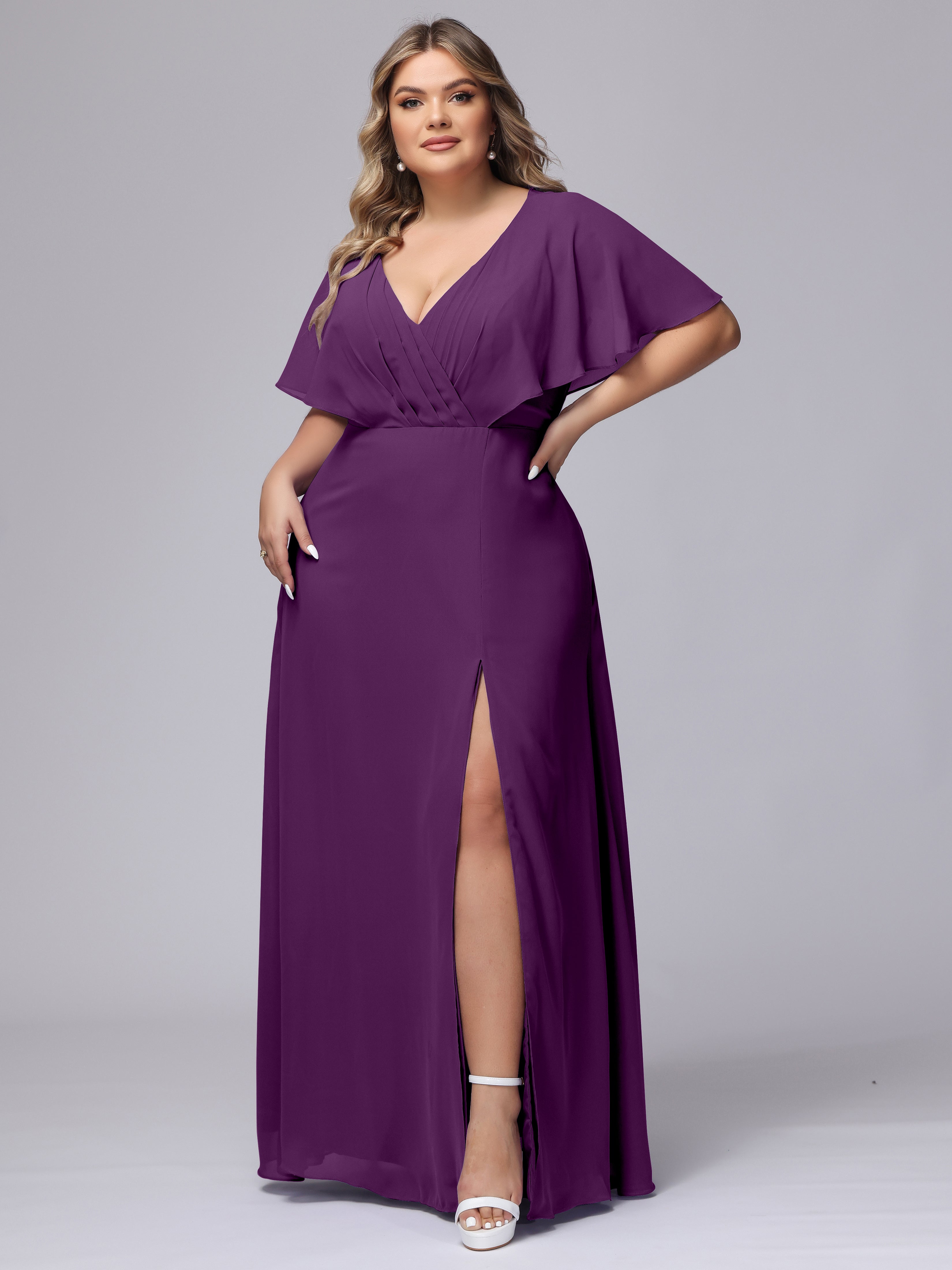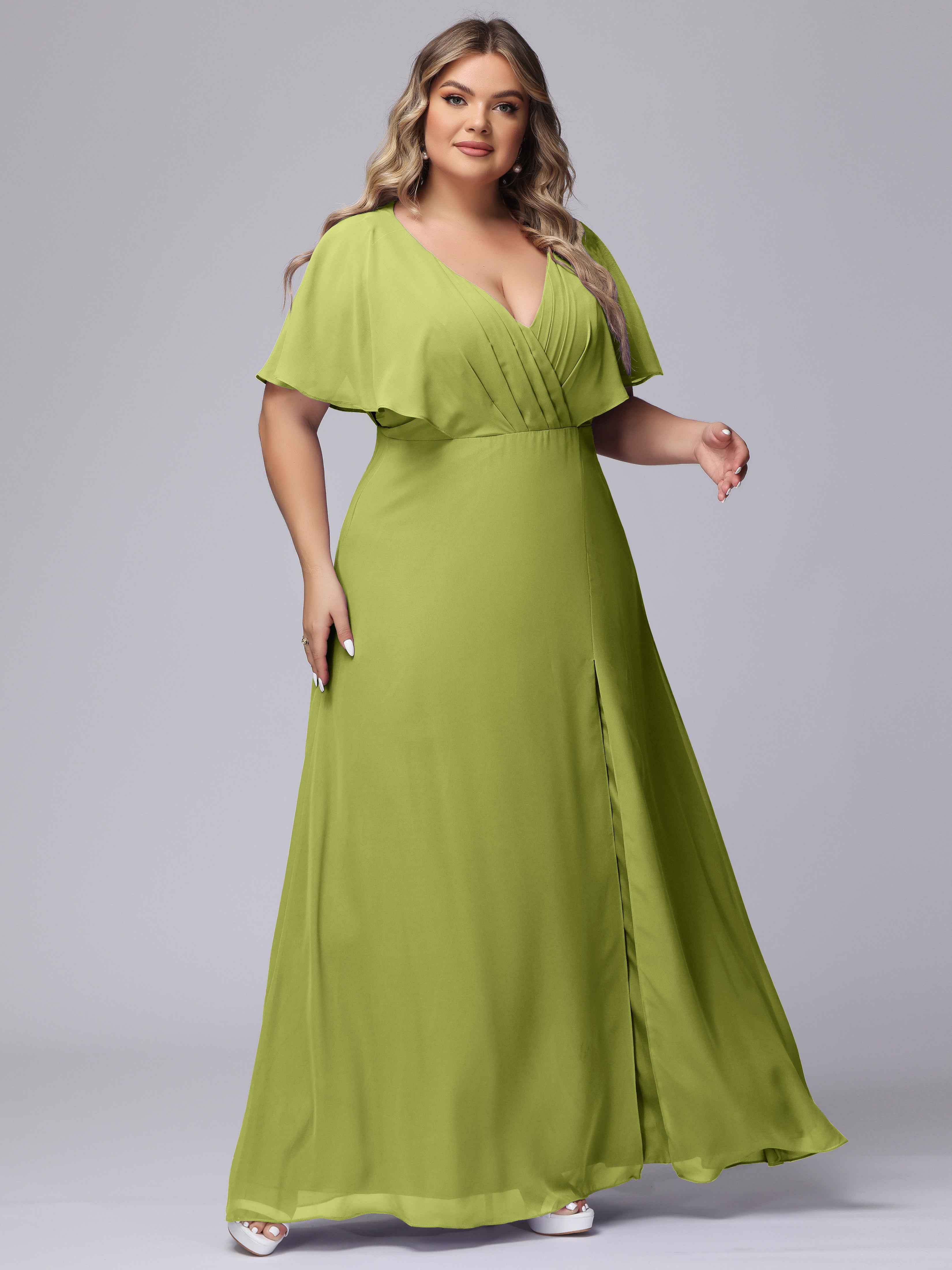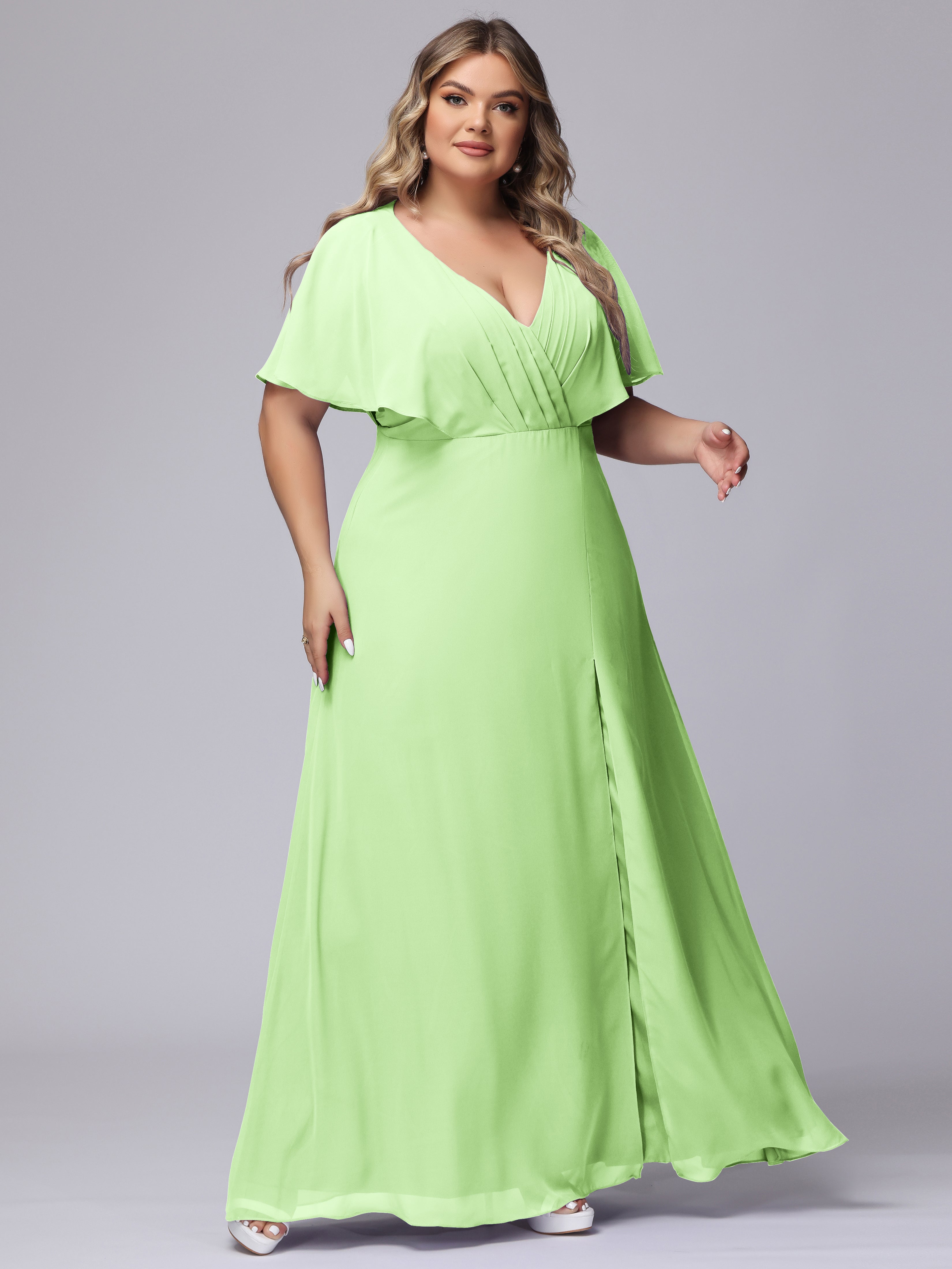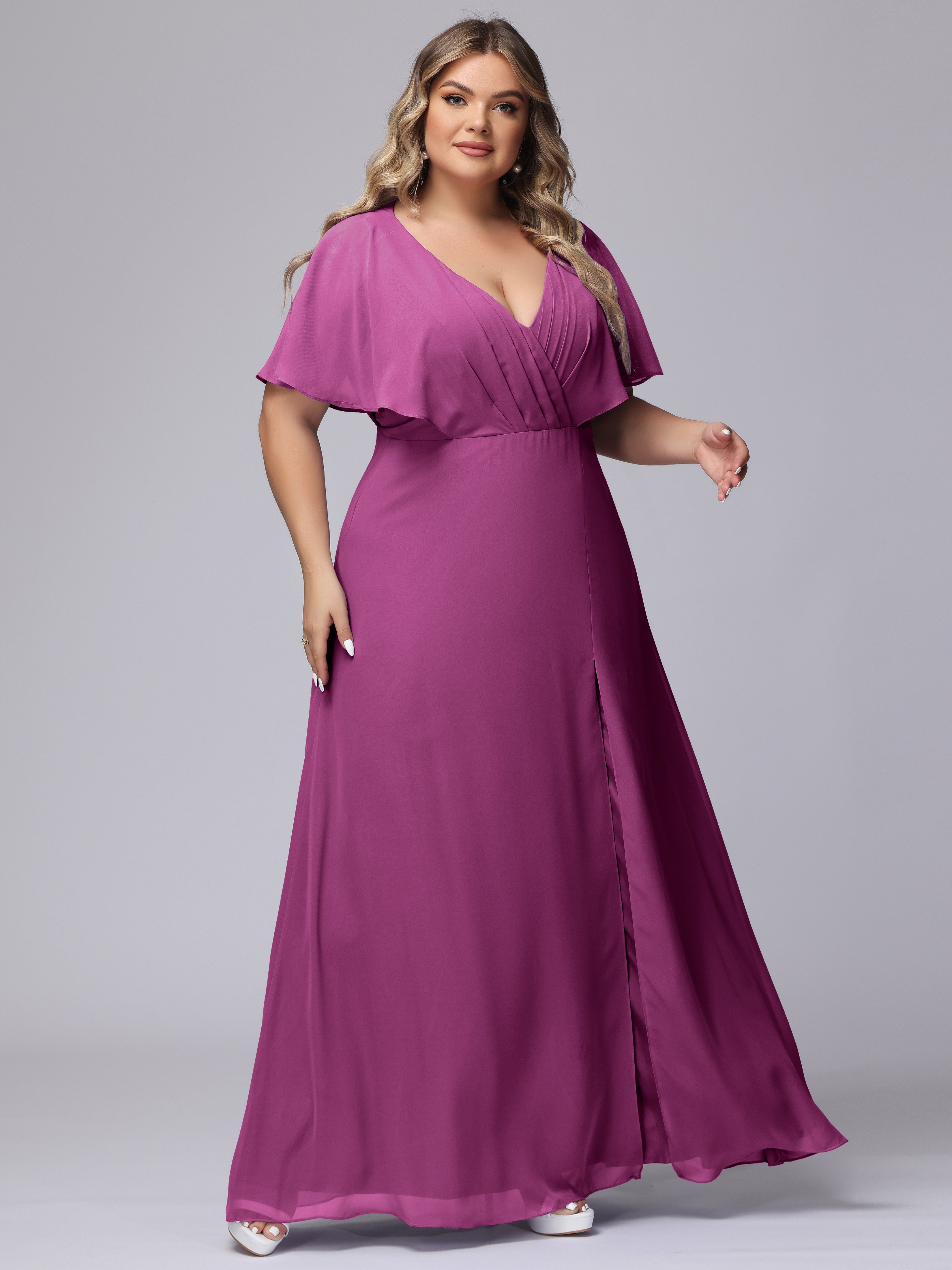 V-Neck Chiffon Short Sleeves Plus Size Bridesmaid Dresses