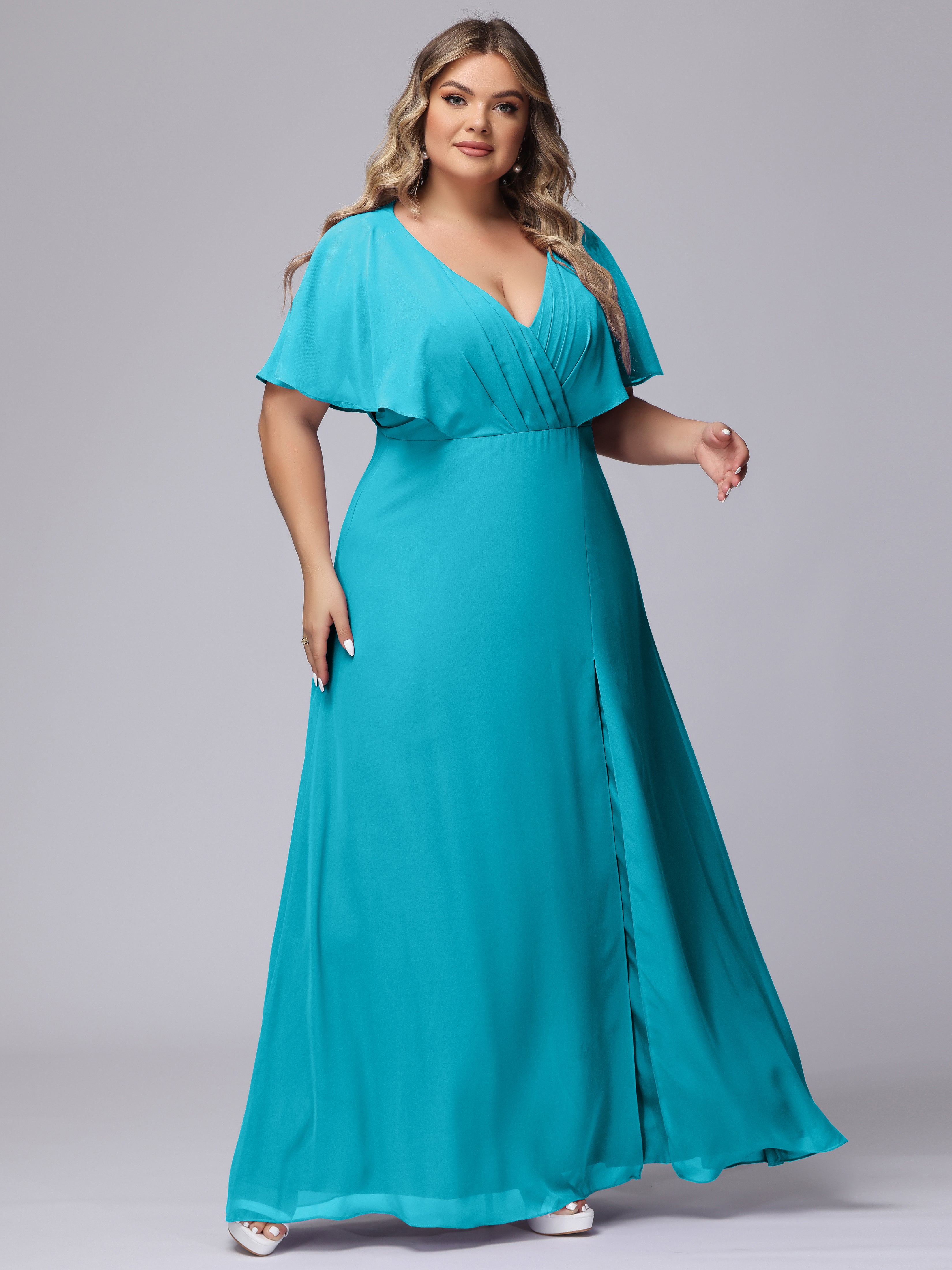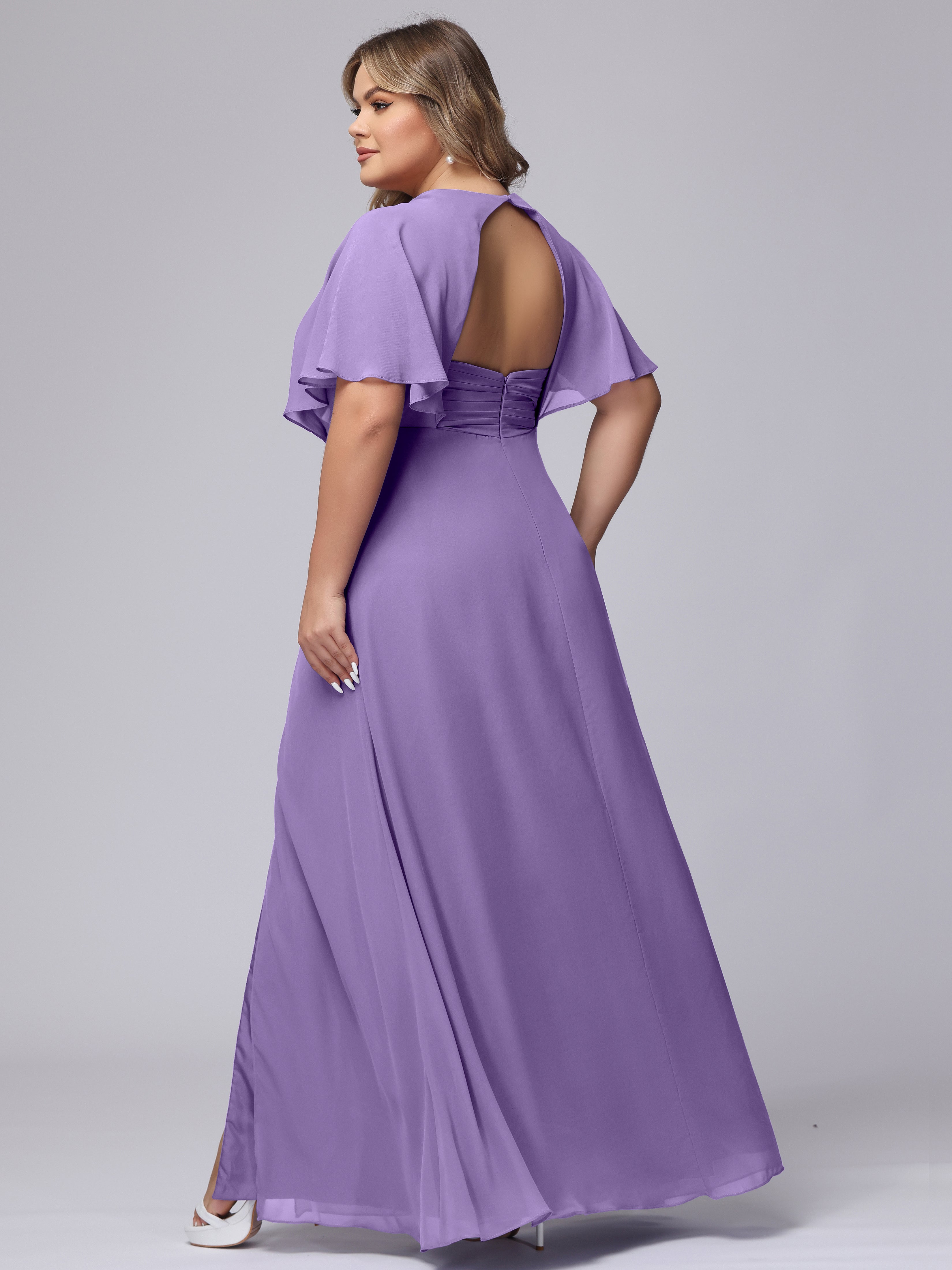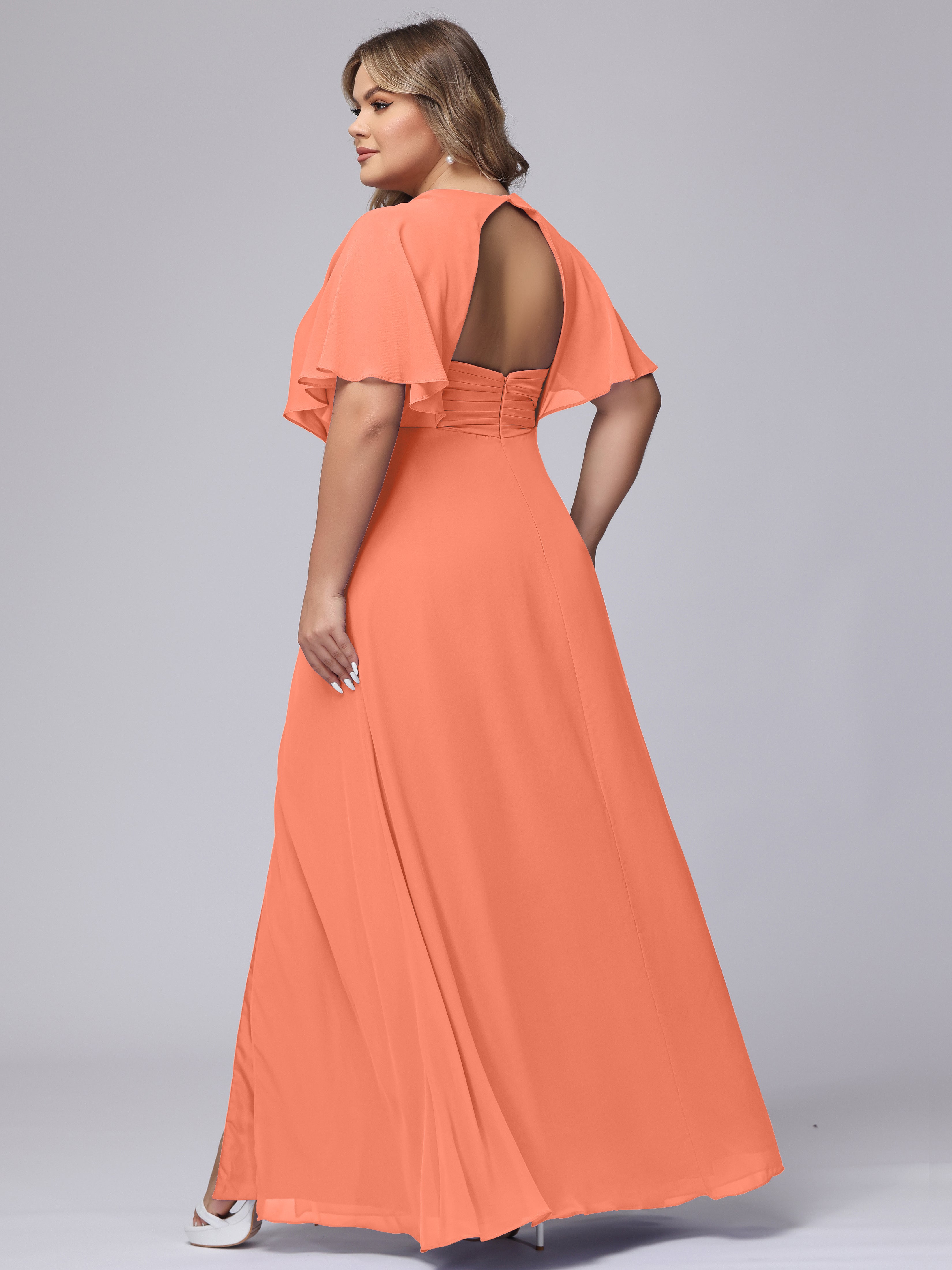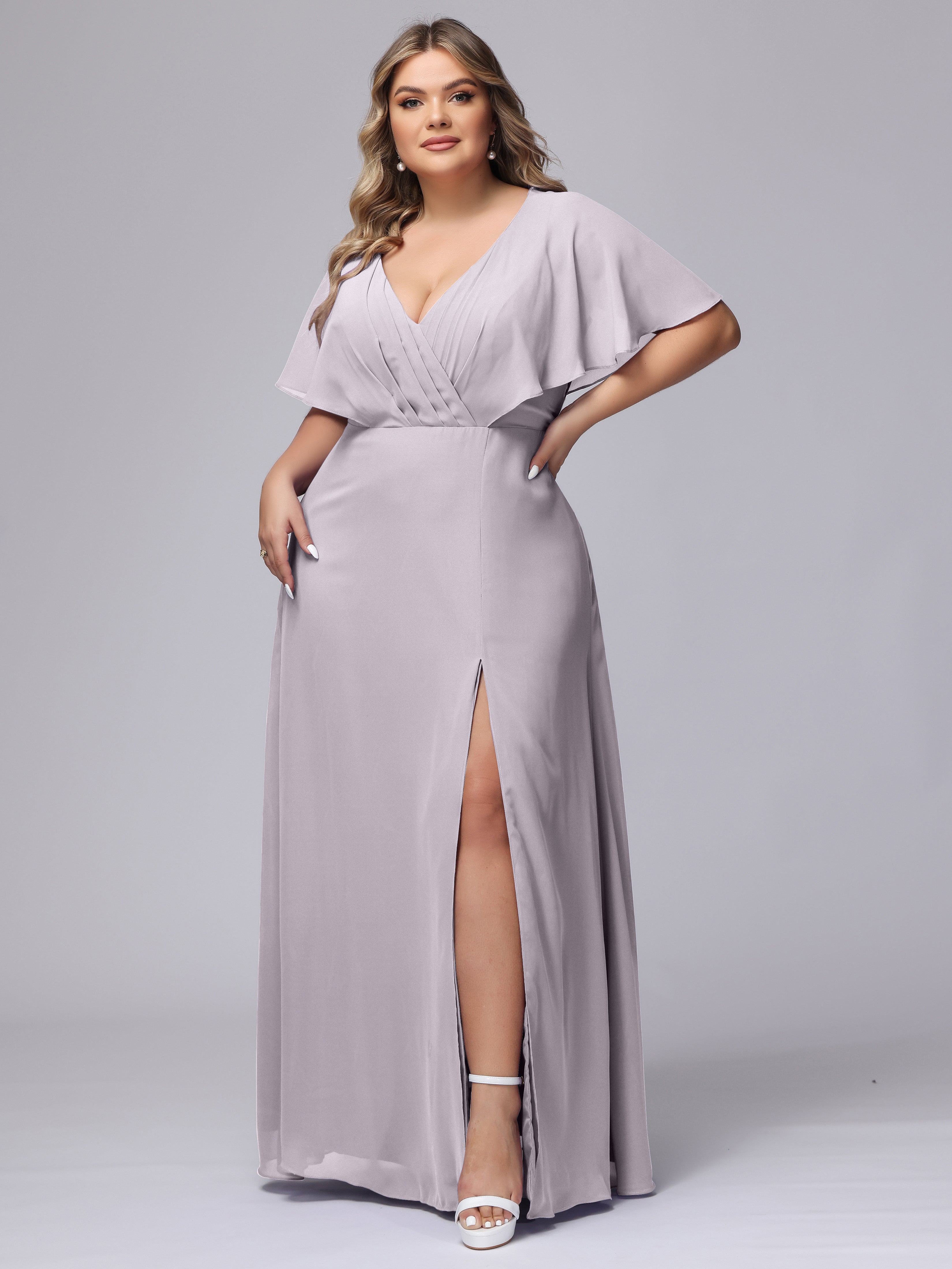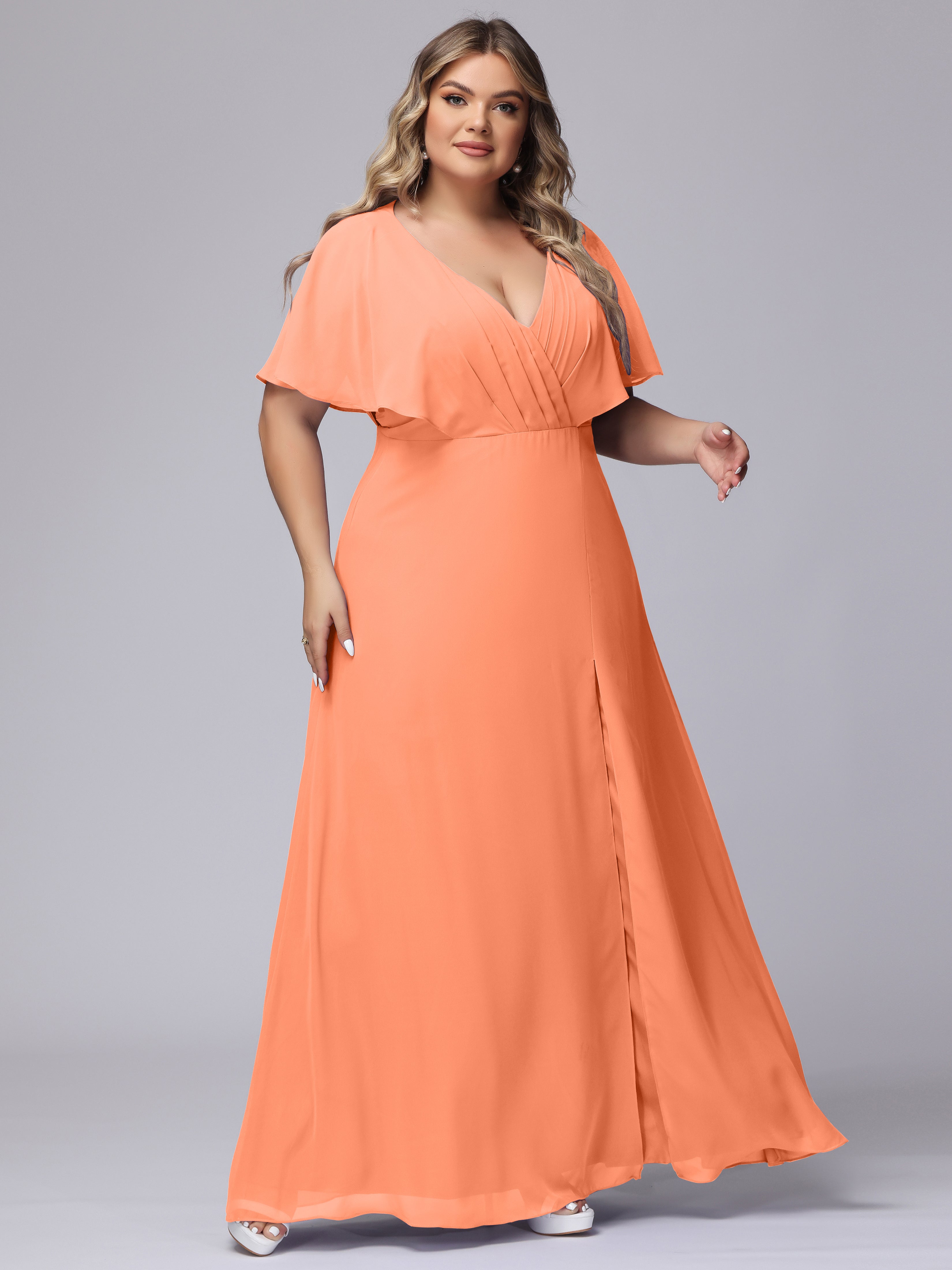 V-Neck Chiffon Short Sleeves Plus Size Bridesmaid Dresses