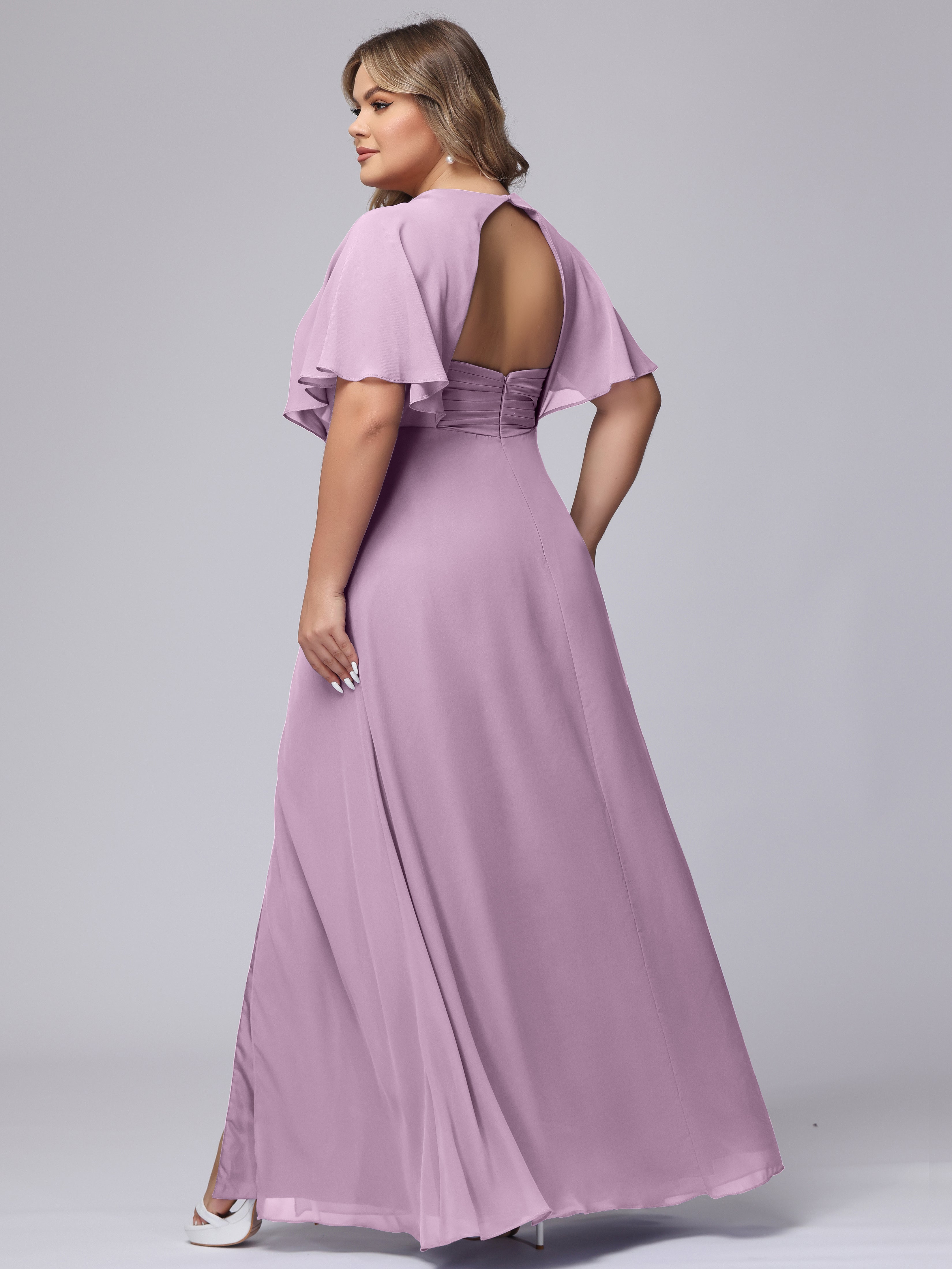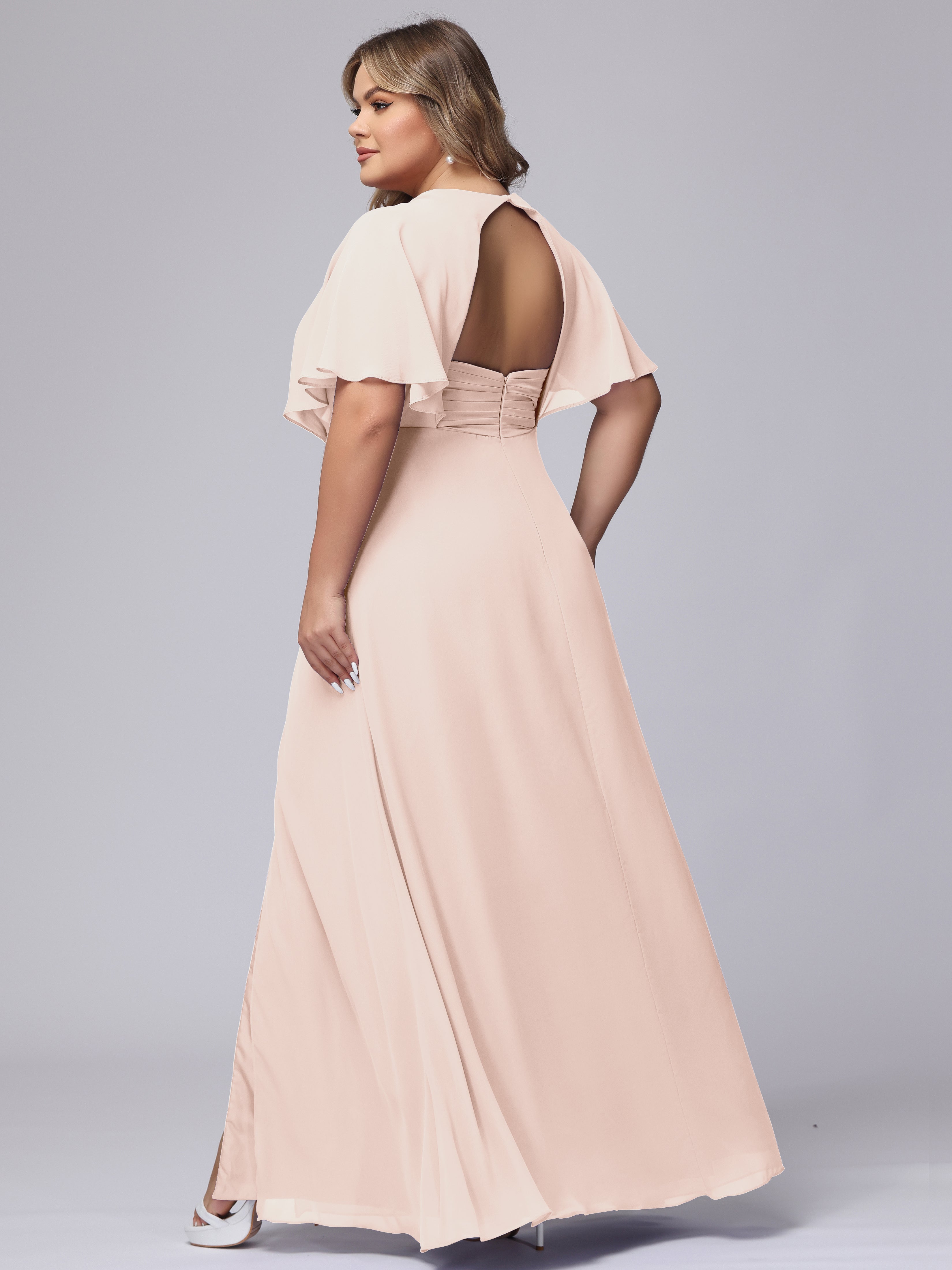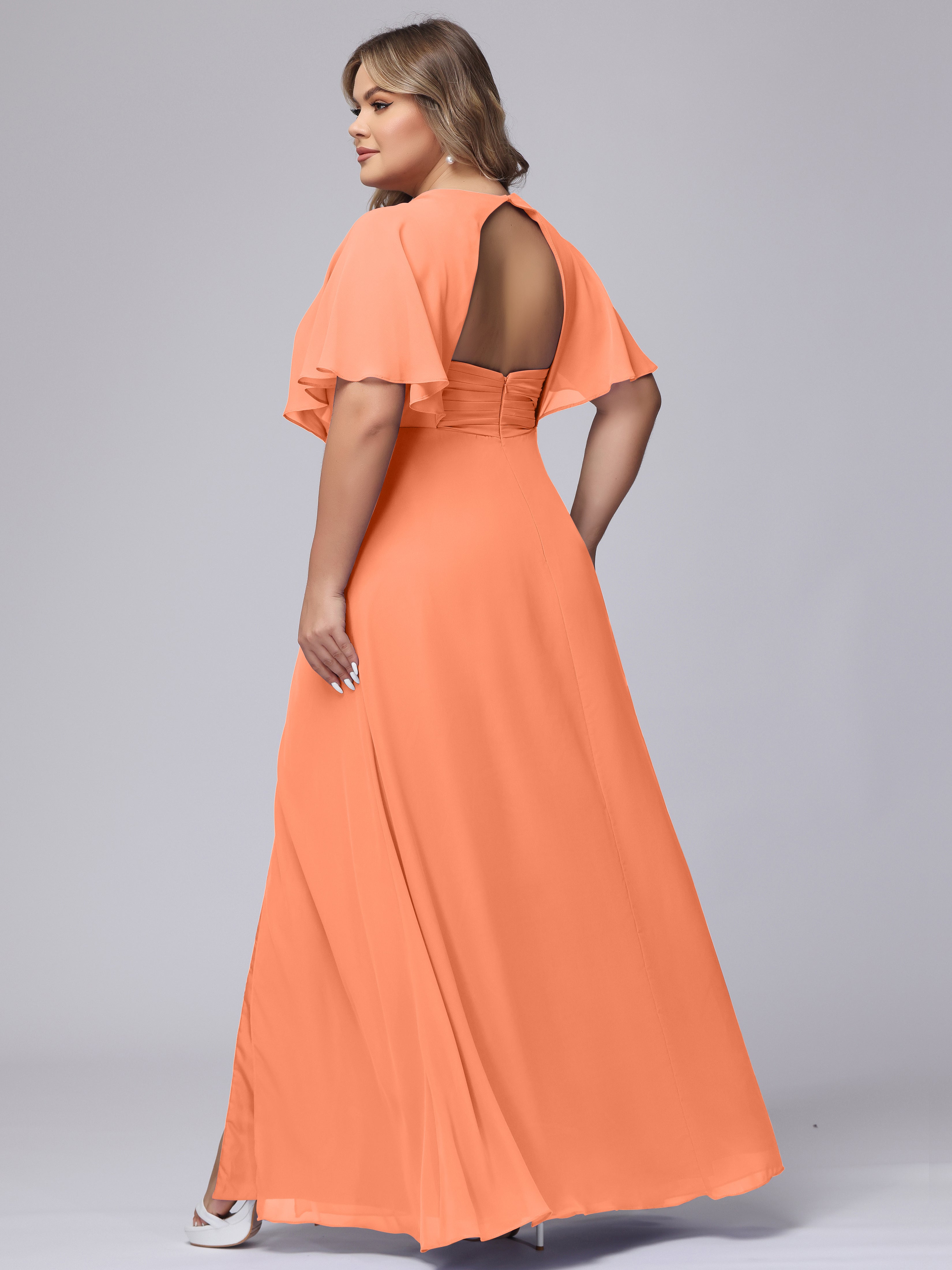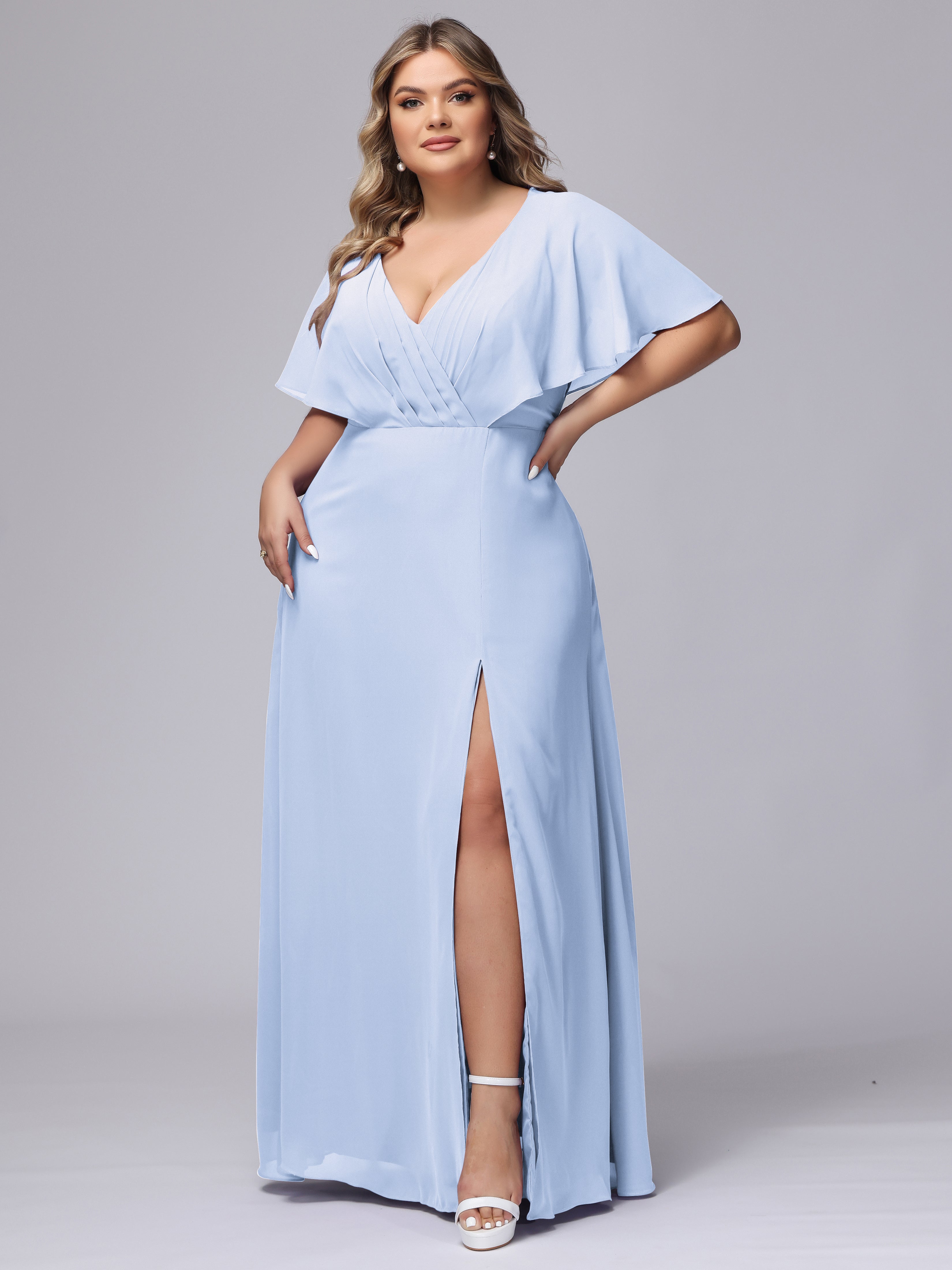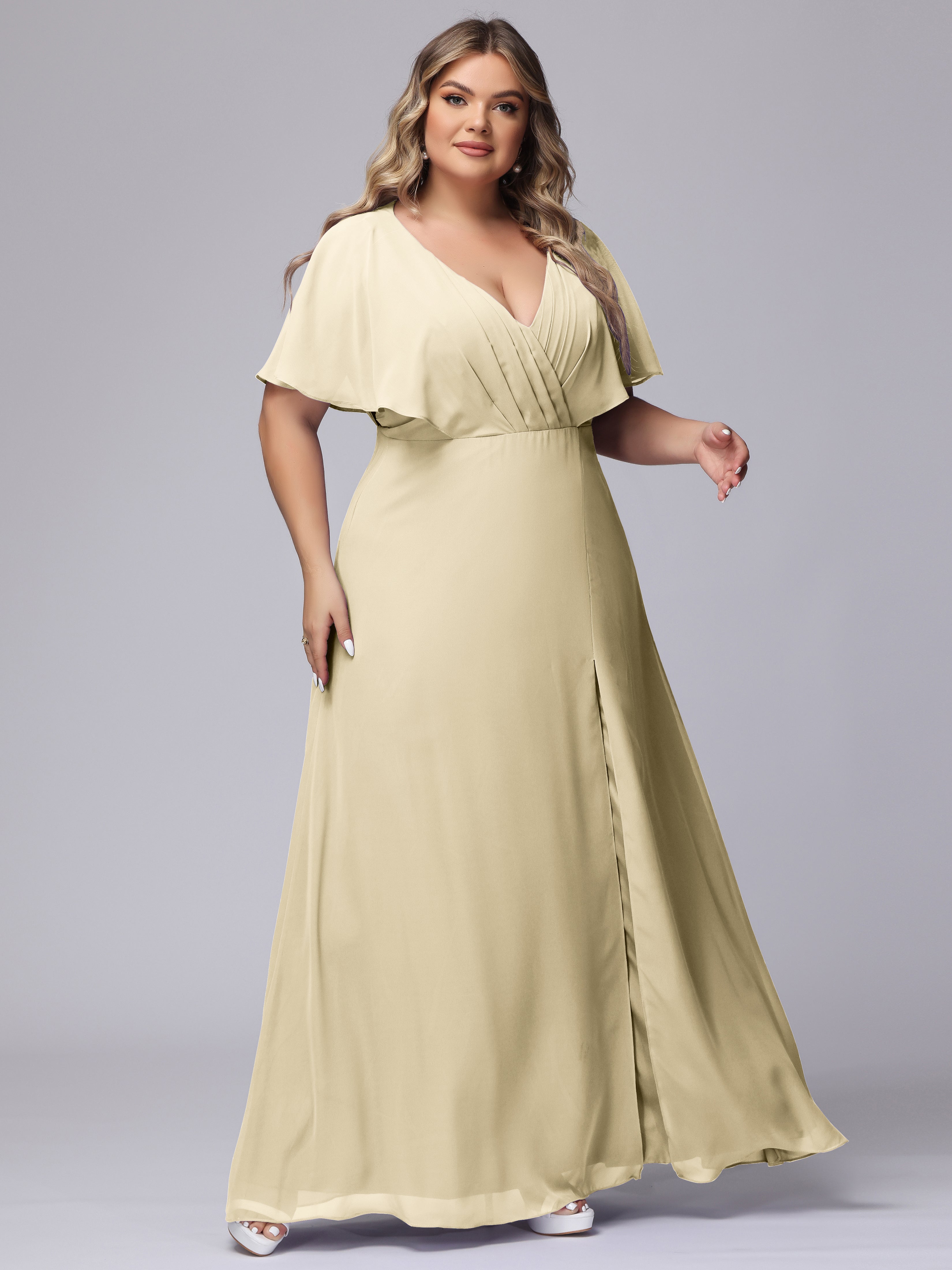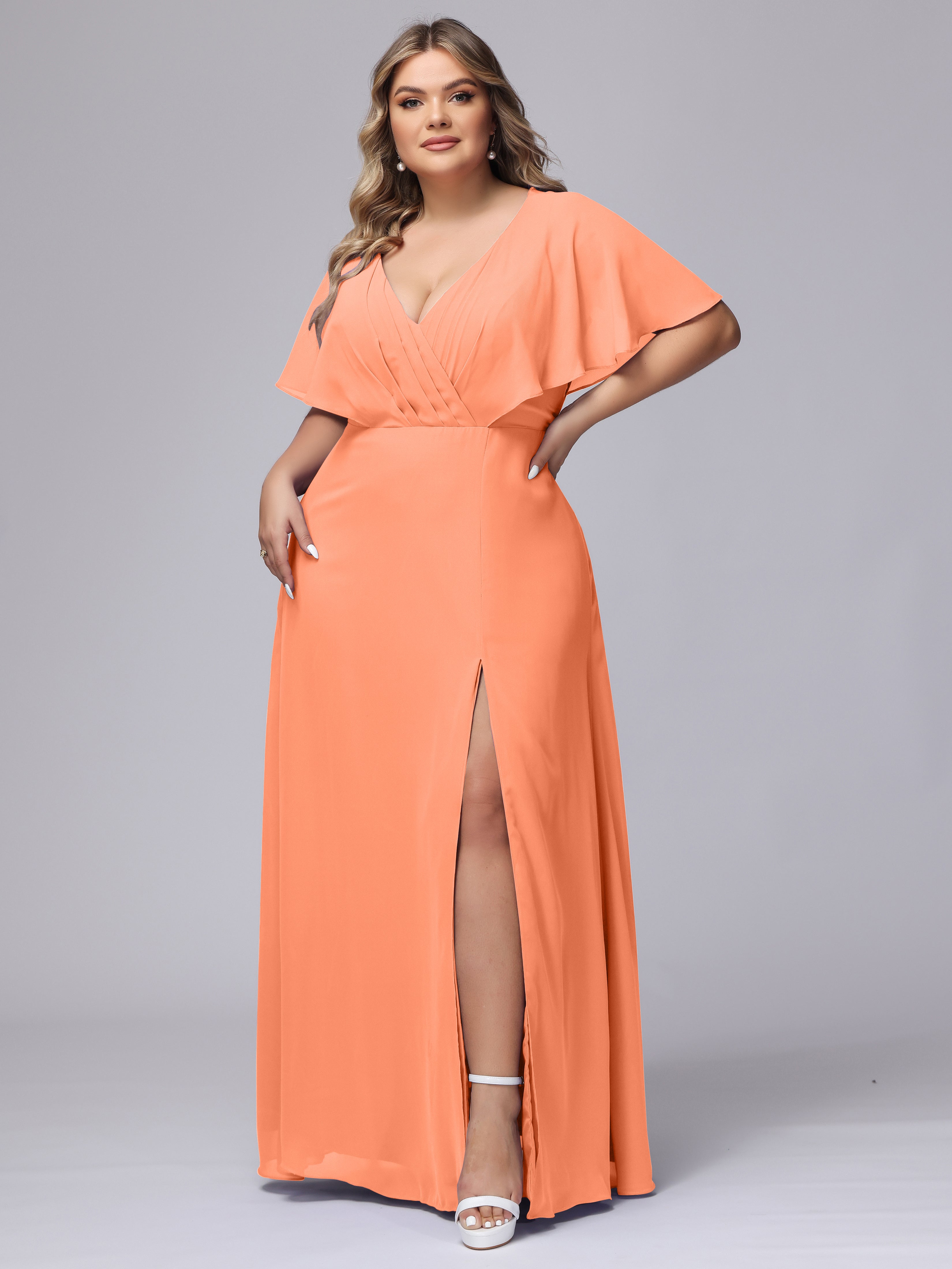 V-Neck Chiffon Short Sleeves Plus Size Bridesmaid Dresses