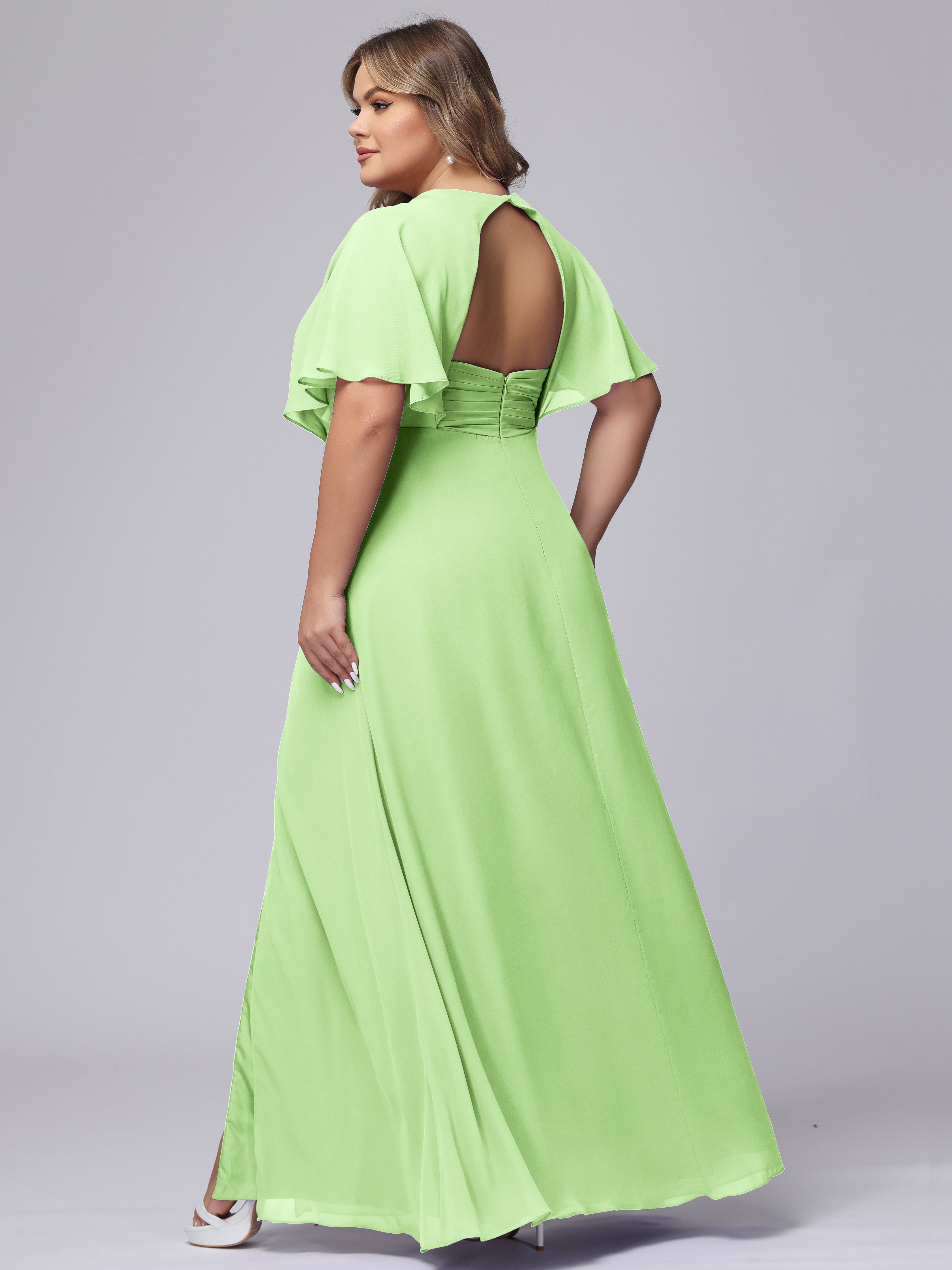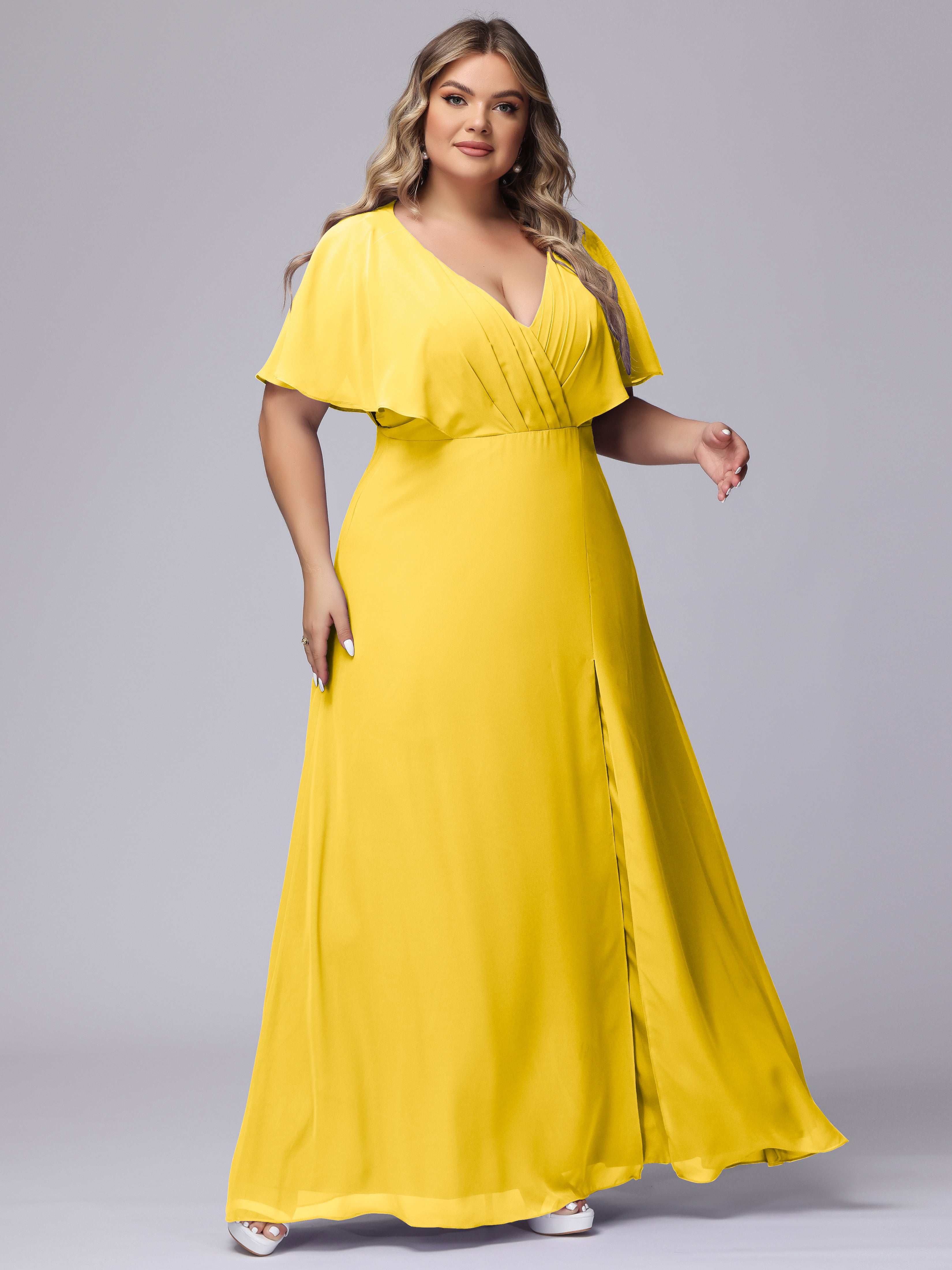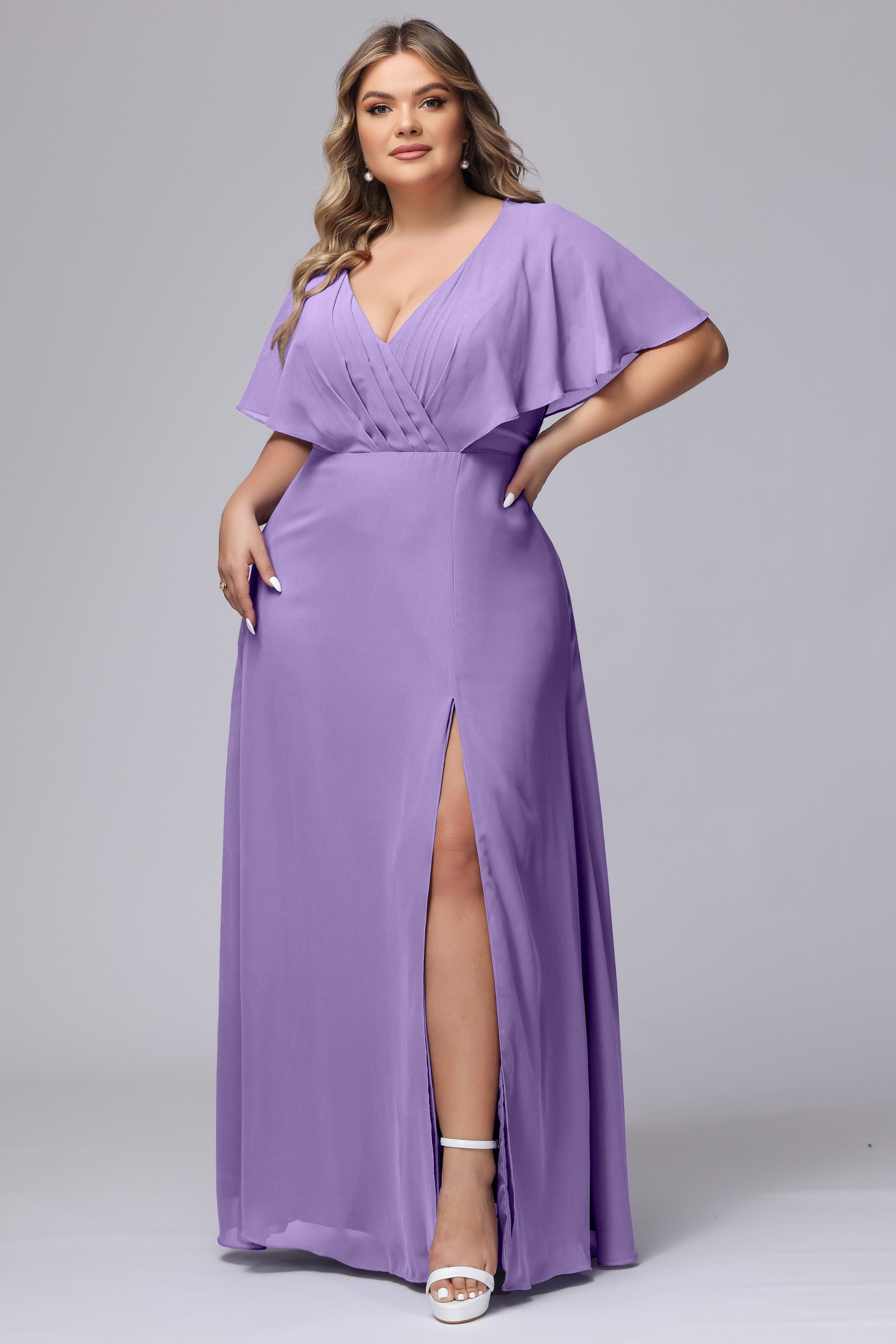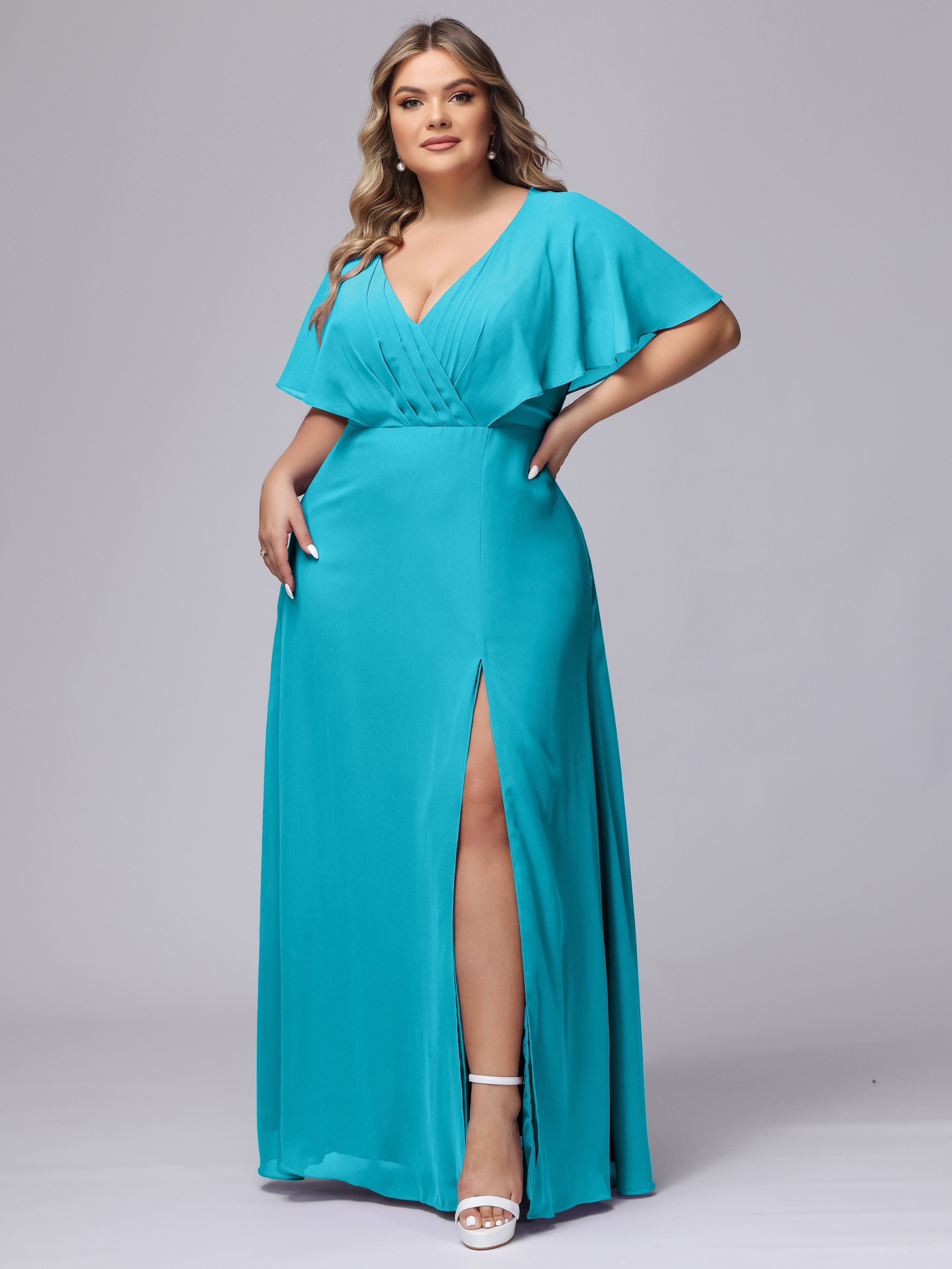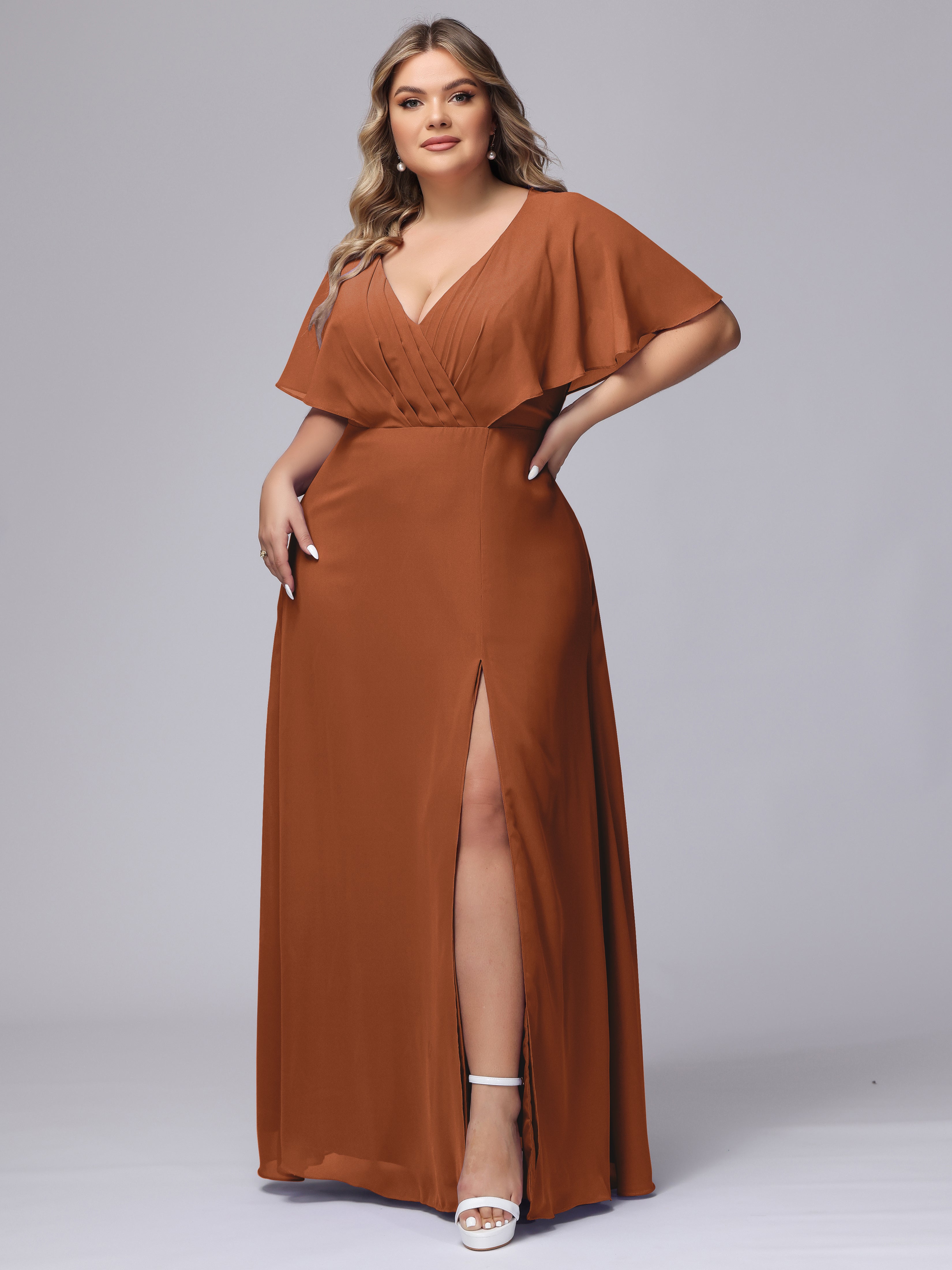 V-Neck Chiffon Short Sleeves Plus Size Bridesmaid Dresses