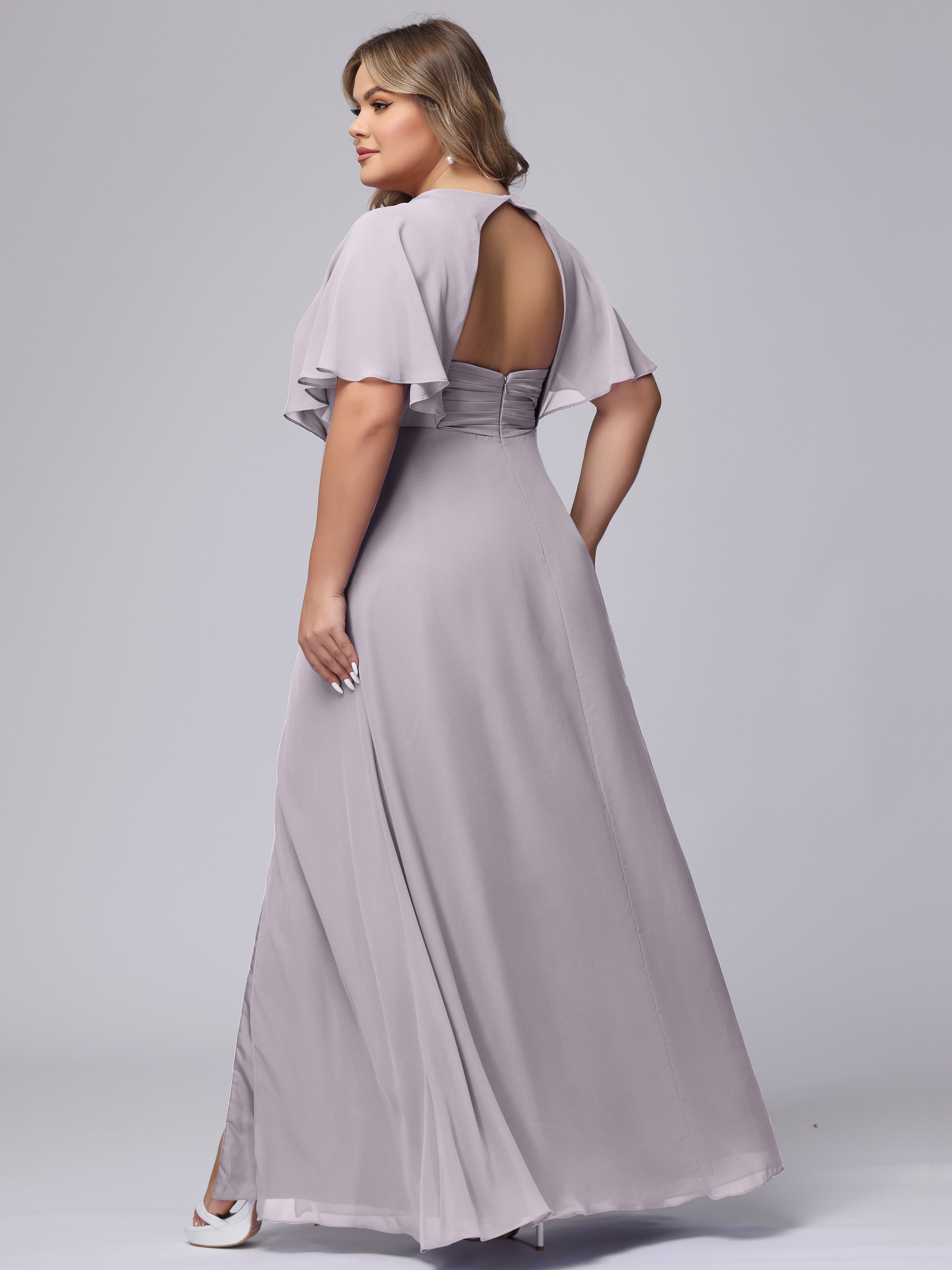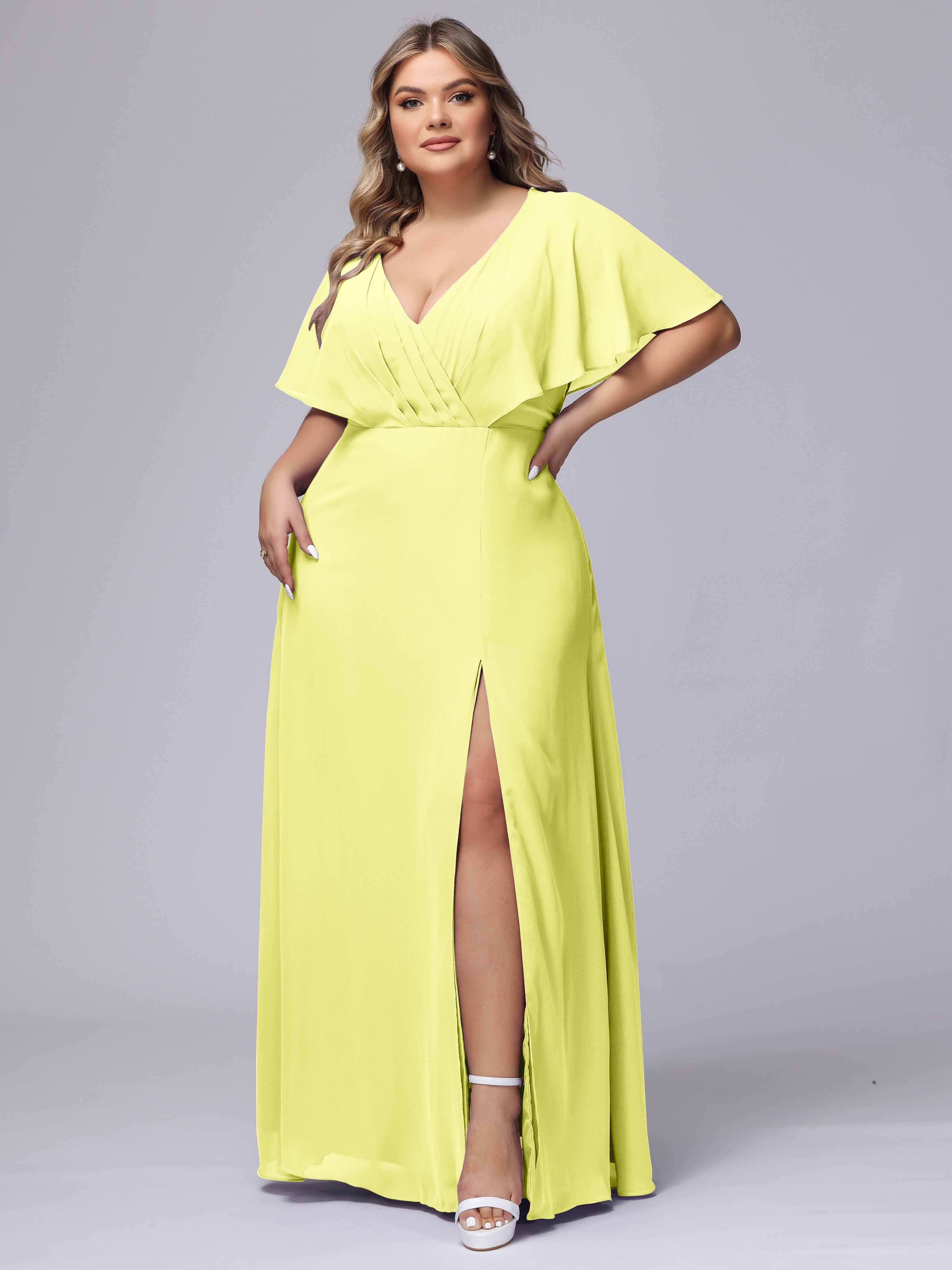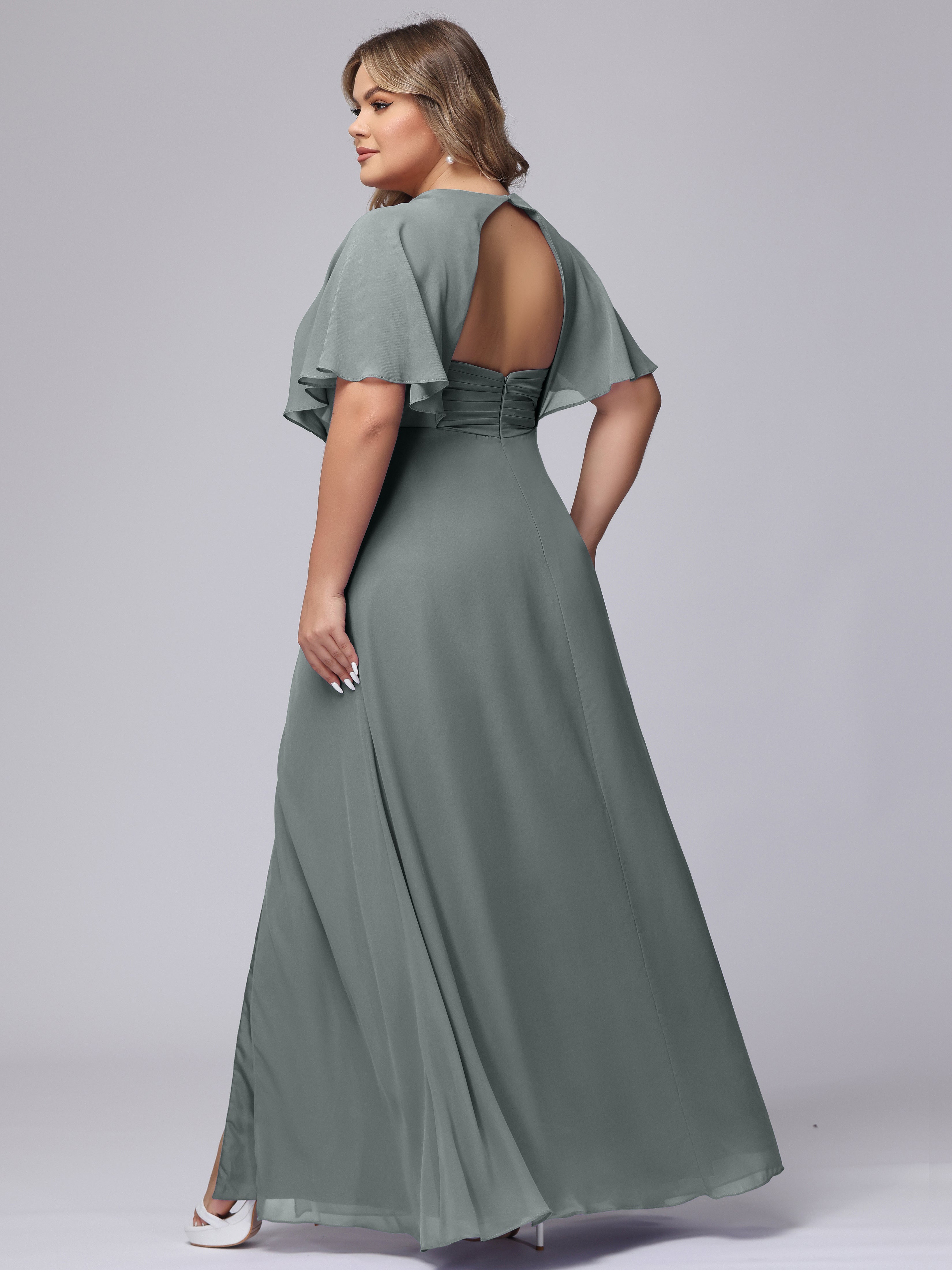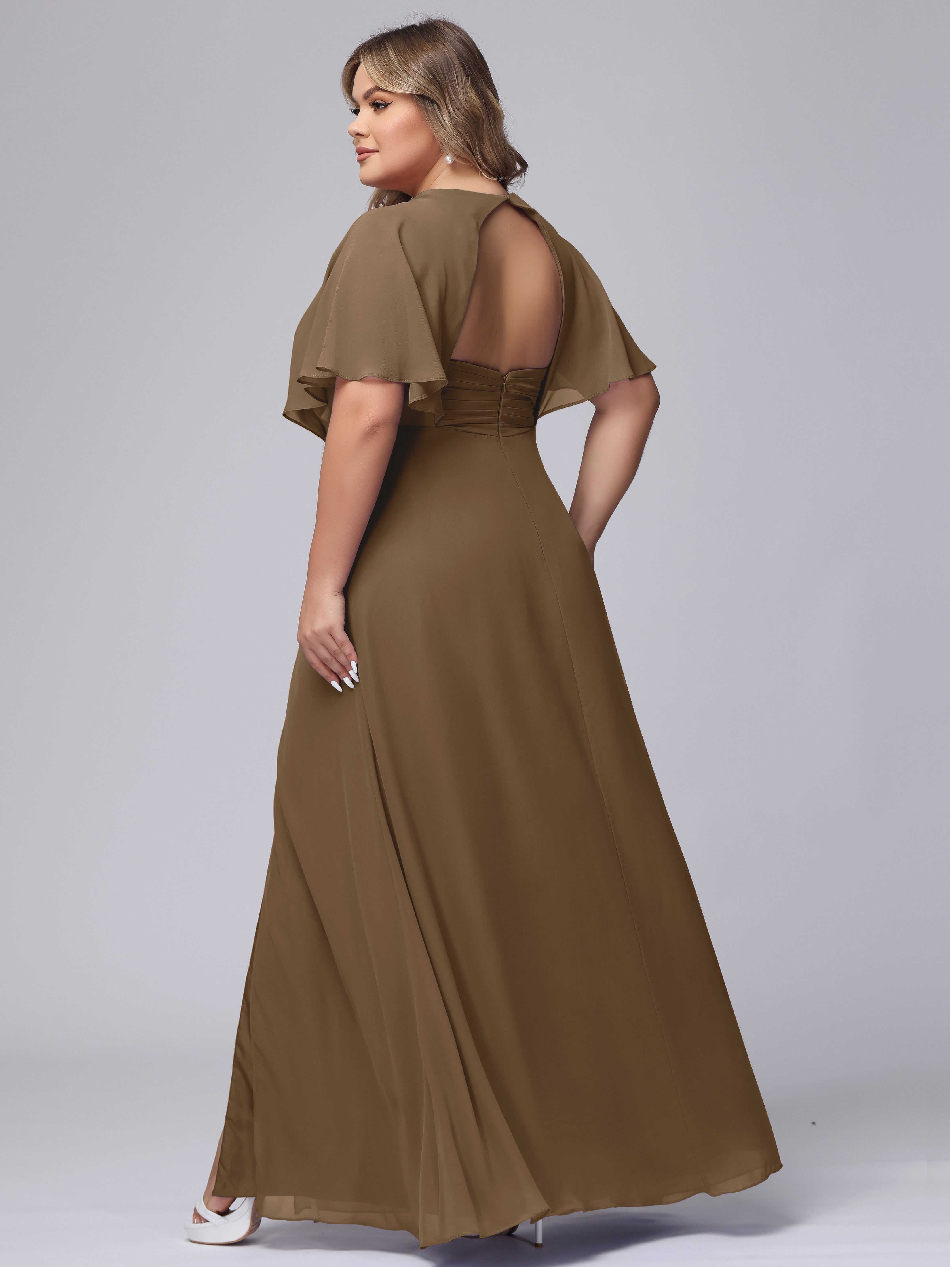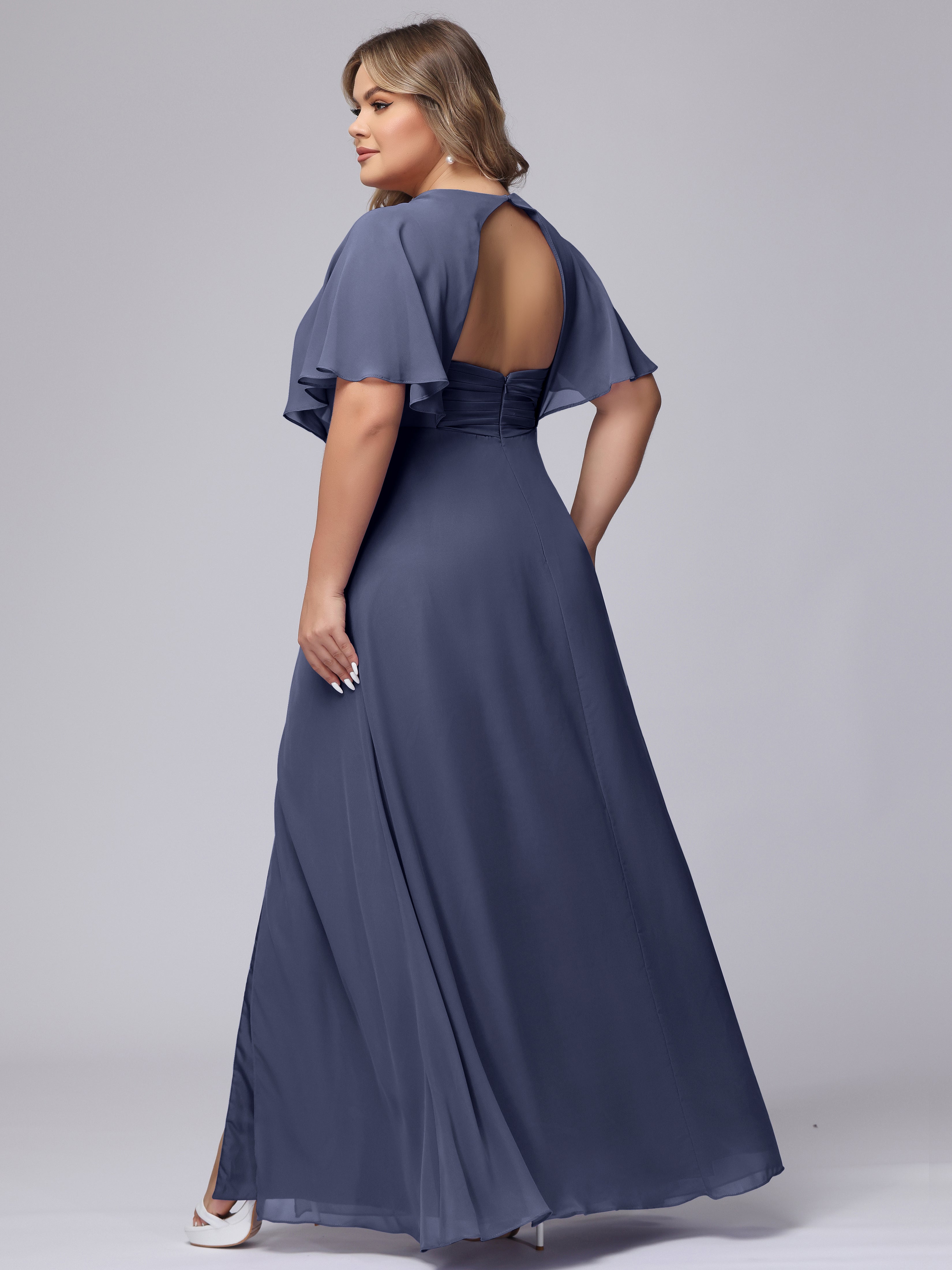 V-Neck Chiffon Short Sleeves Plus Size Bridesmaid Dresses