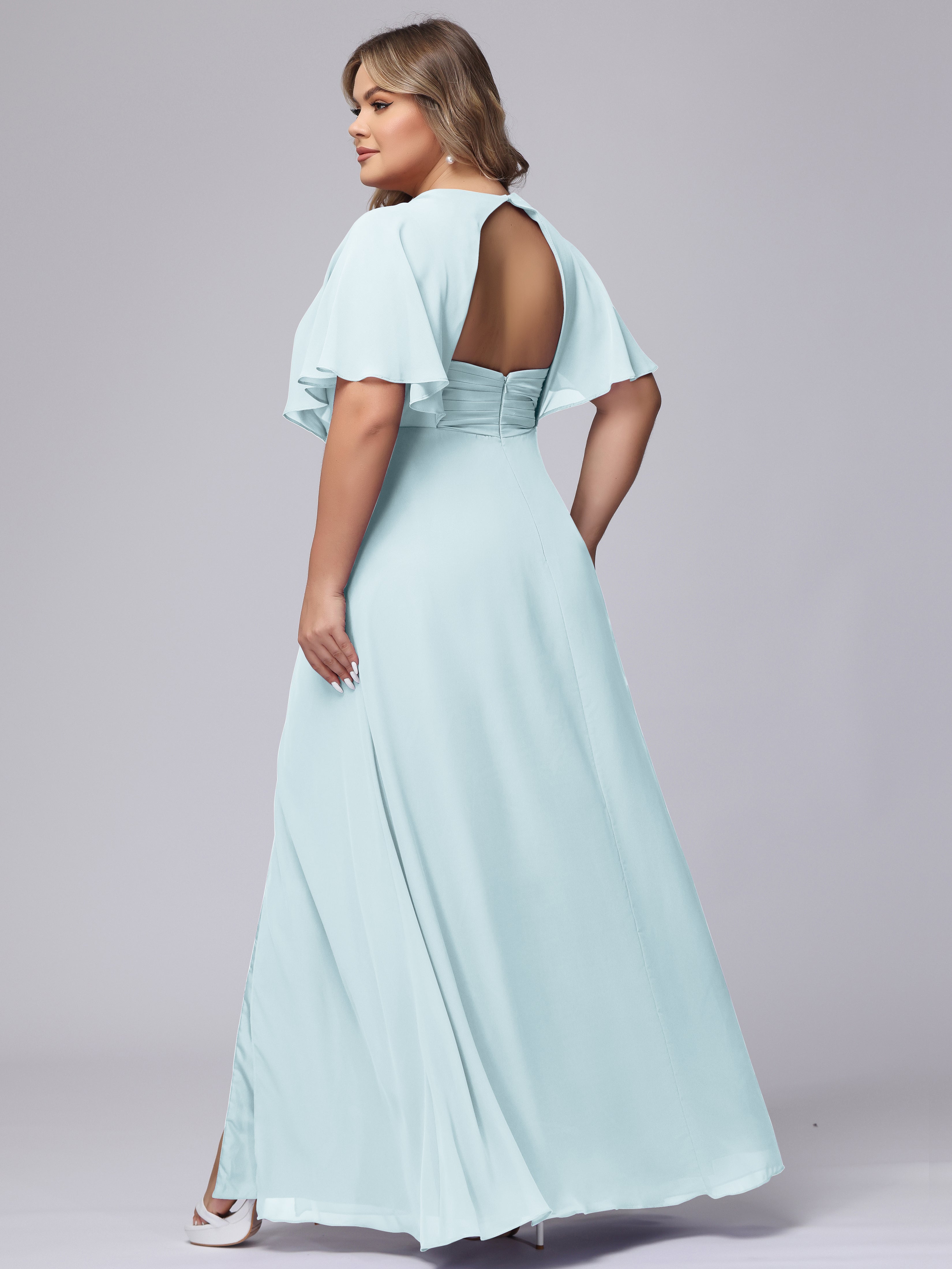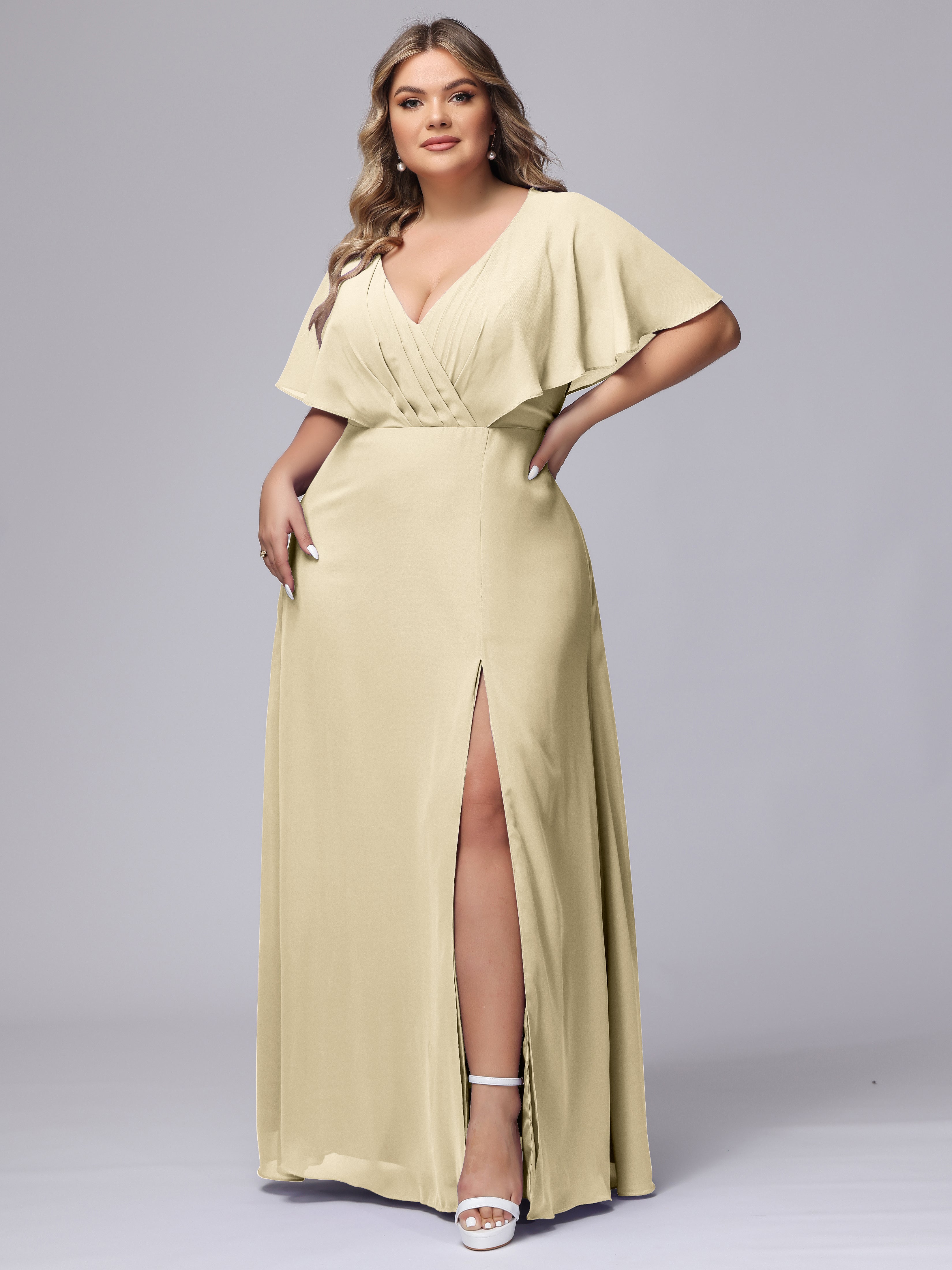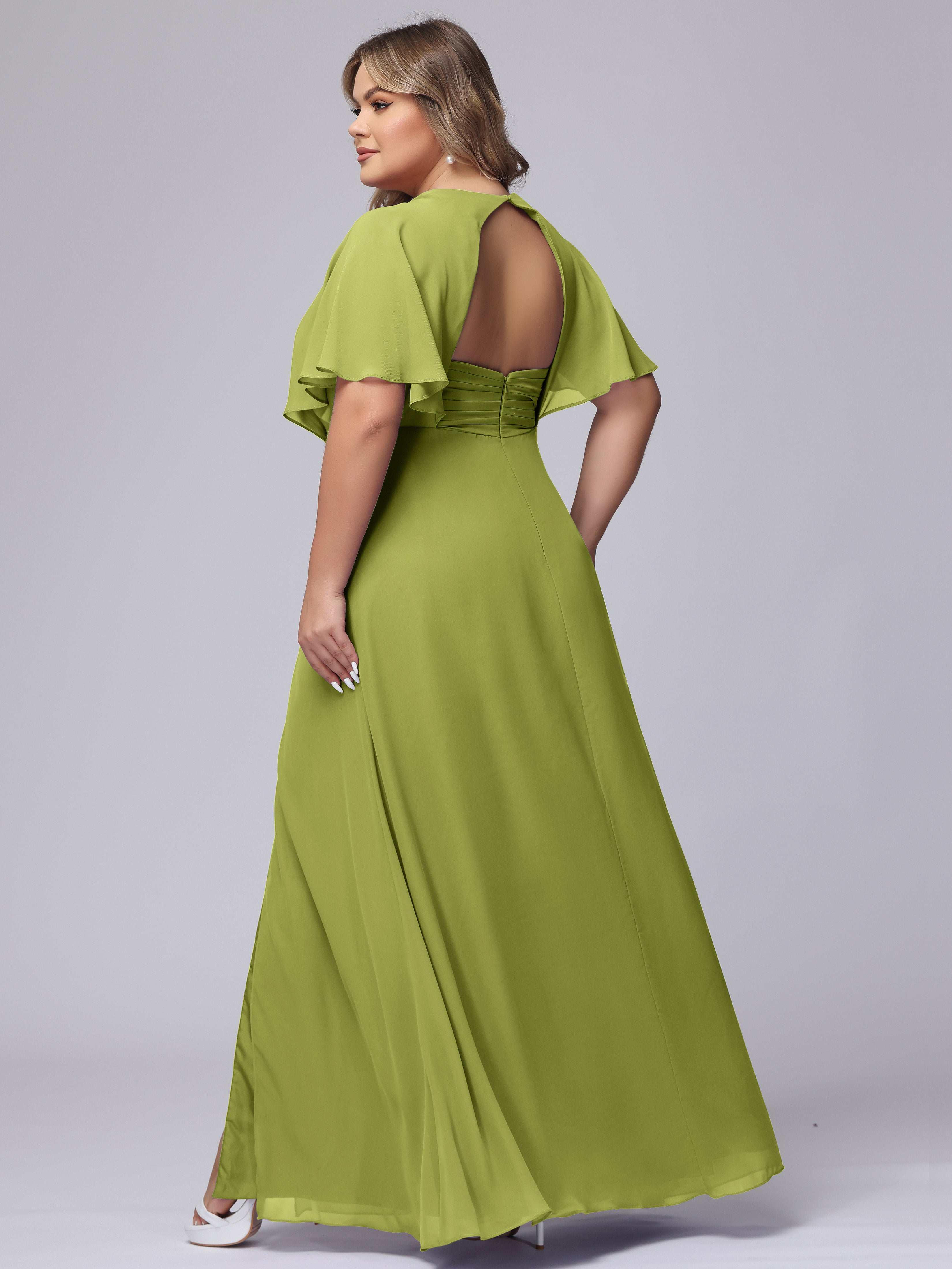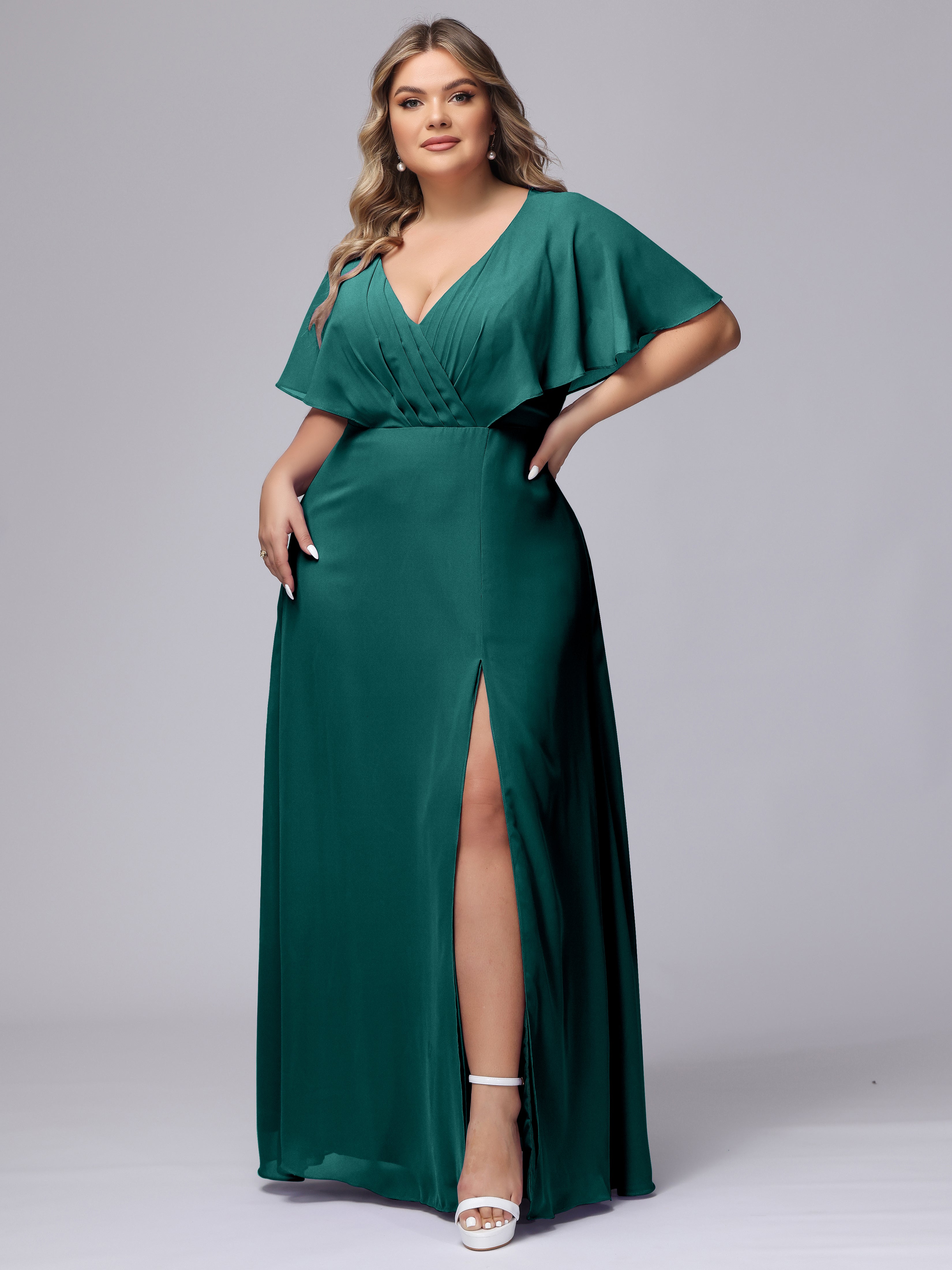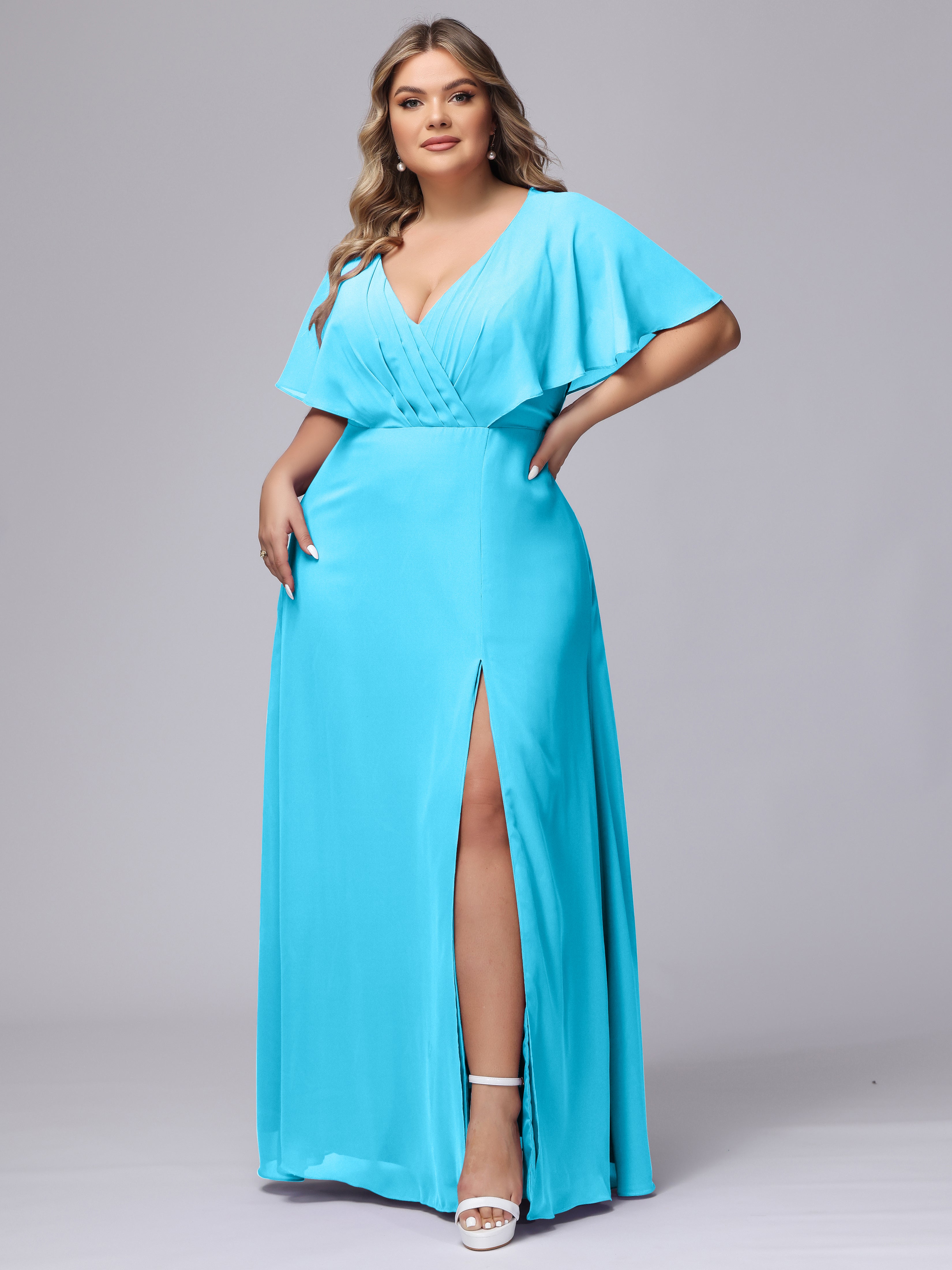 V-Neck Chiffon Short Sleeves Plus Size Bridesmaid Dresses